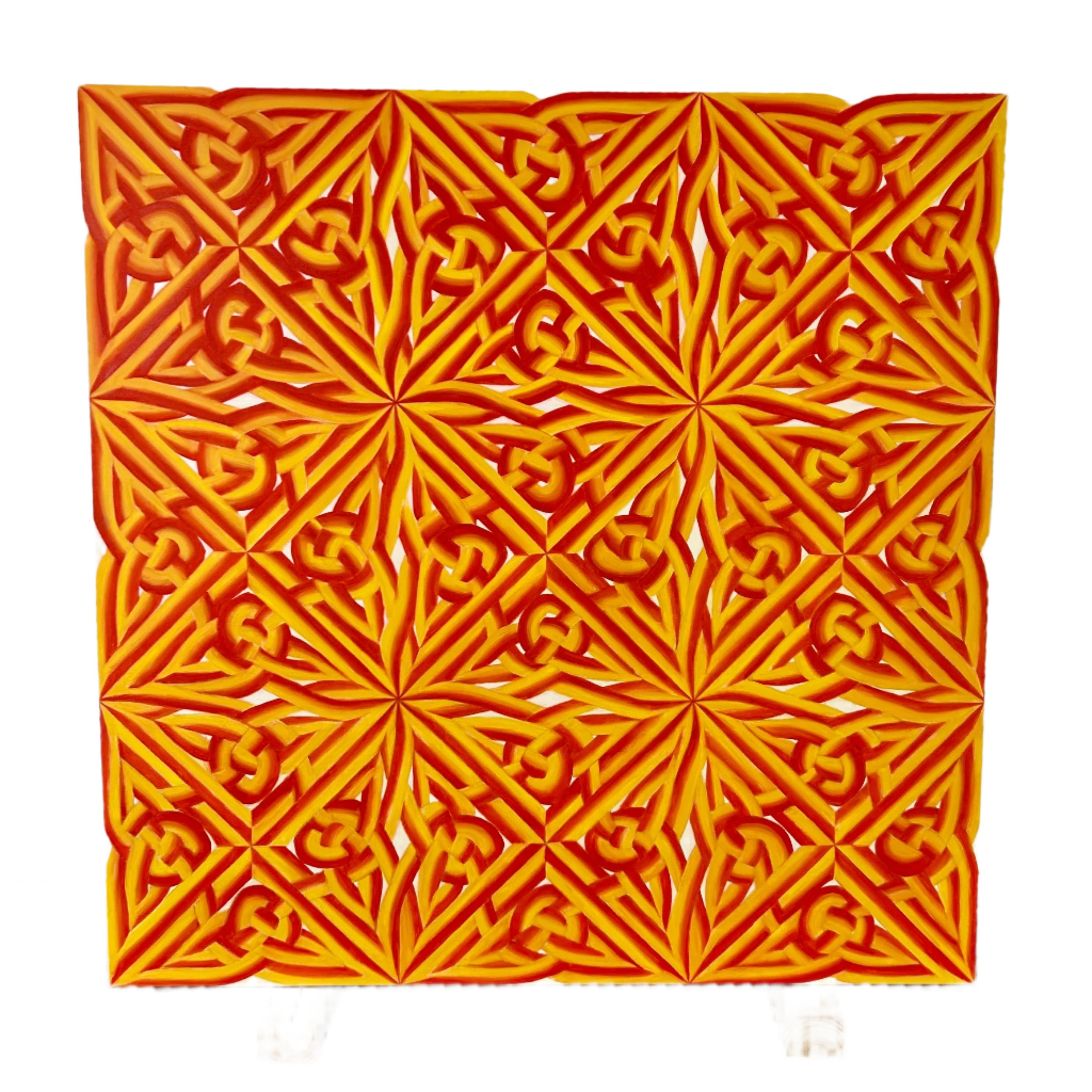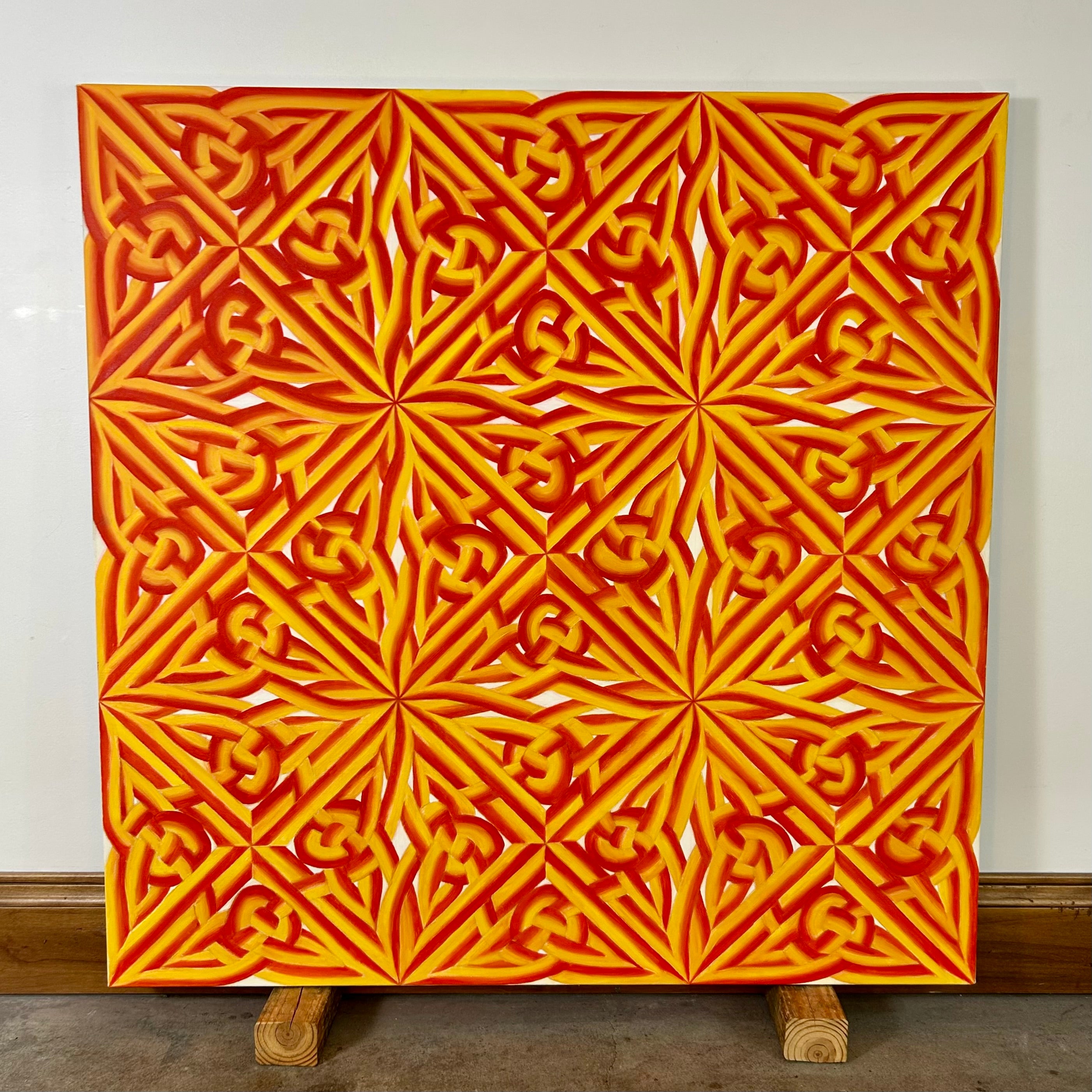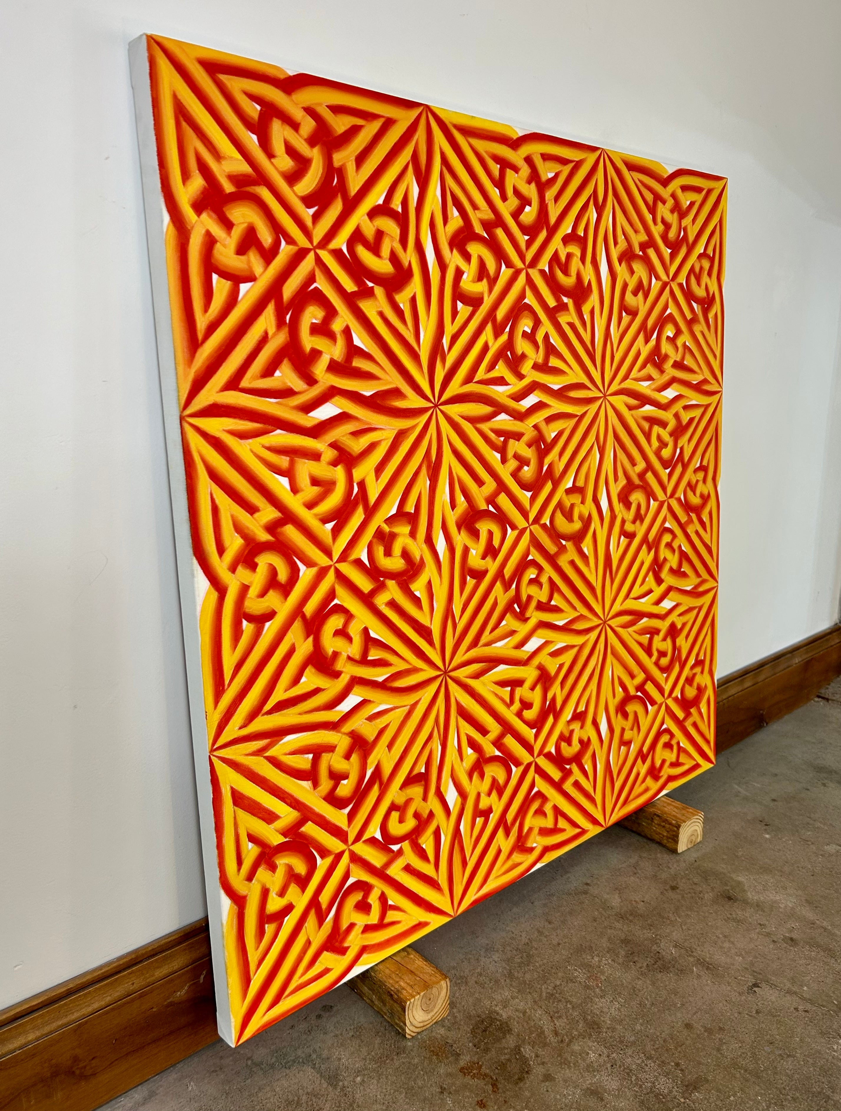 According to the artist, the design is based on early Celtic designs. Colors include golden yellow, orange and red. Sunny Gibbons is a nationally recognized visual artist from Nebraska. New work, 2025