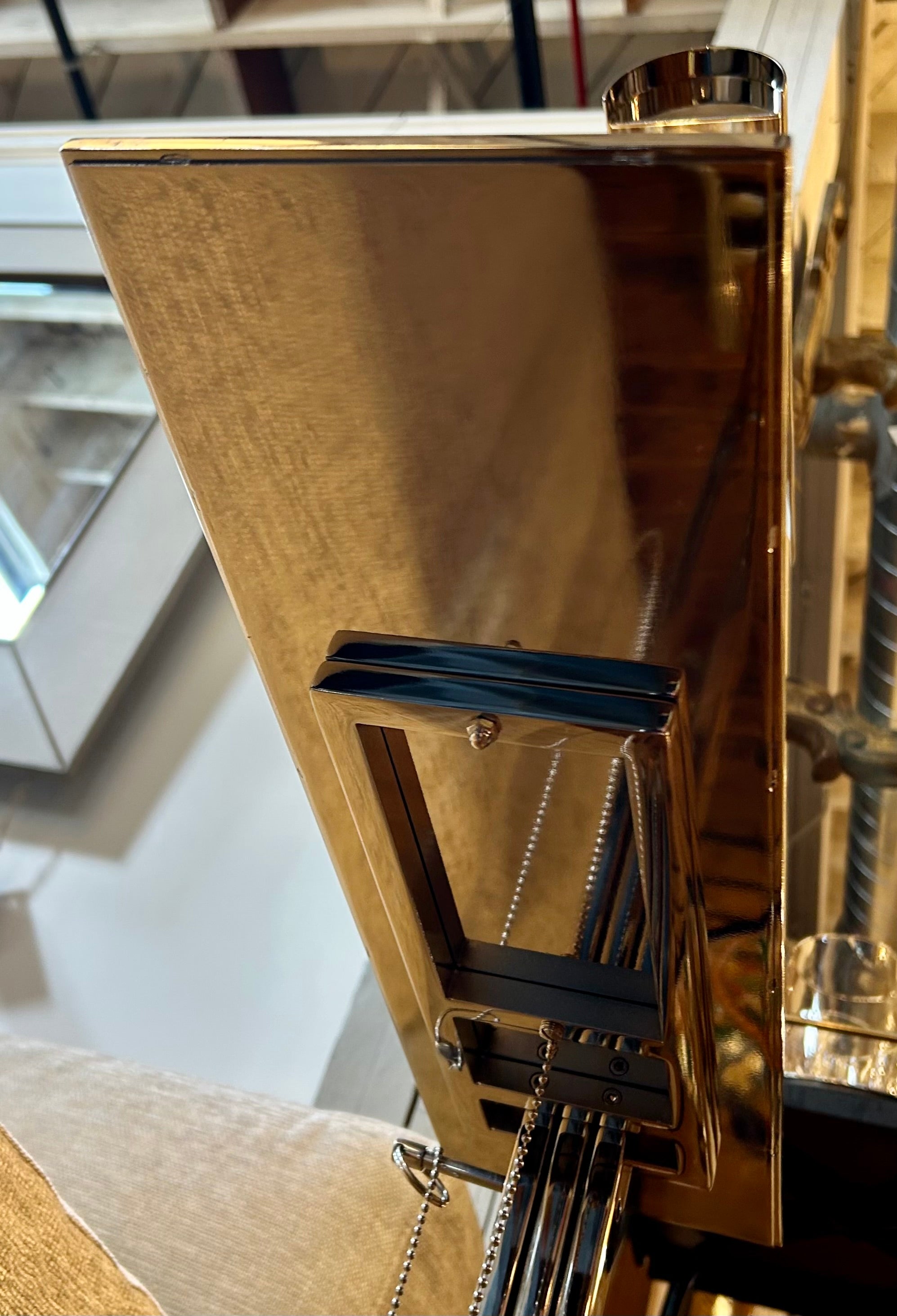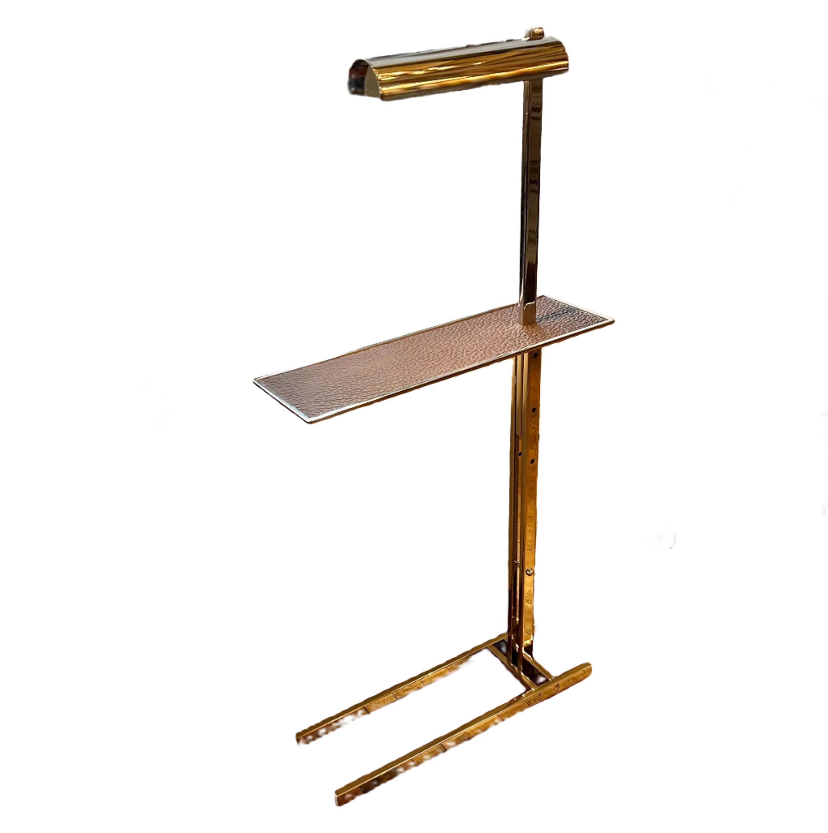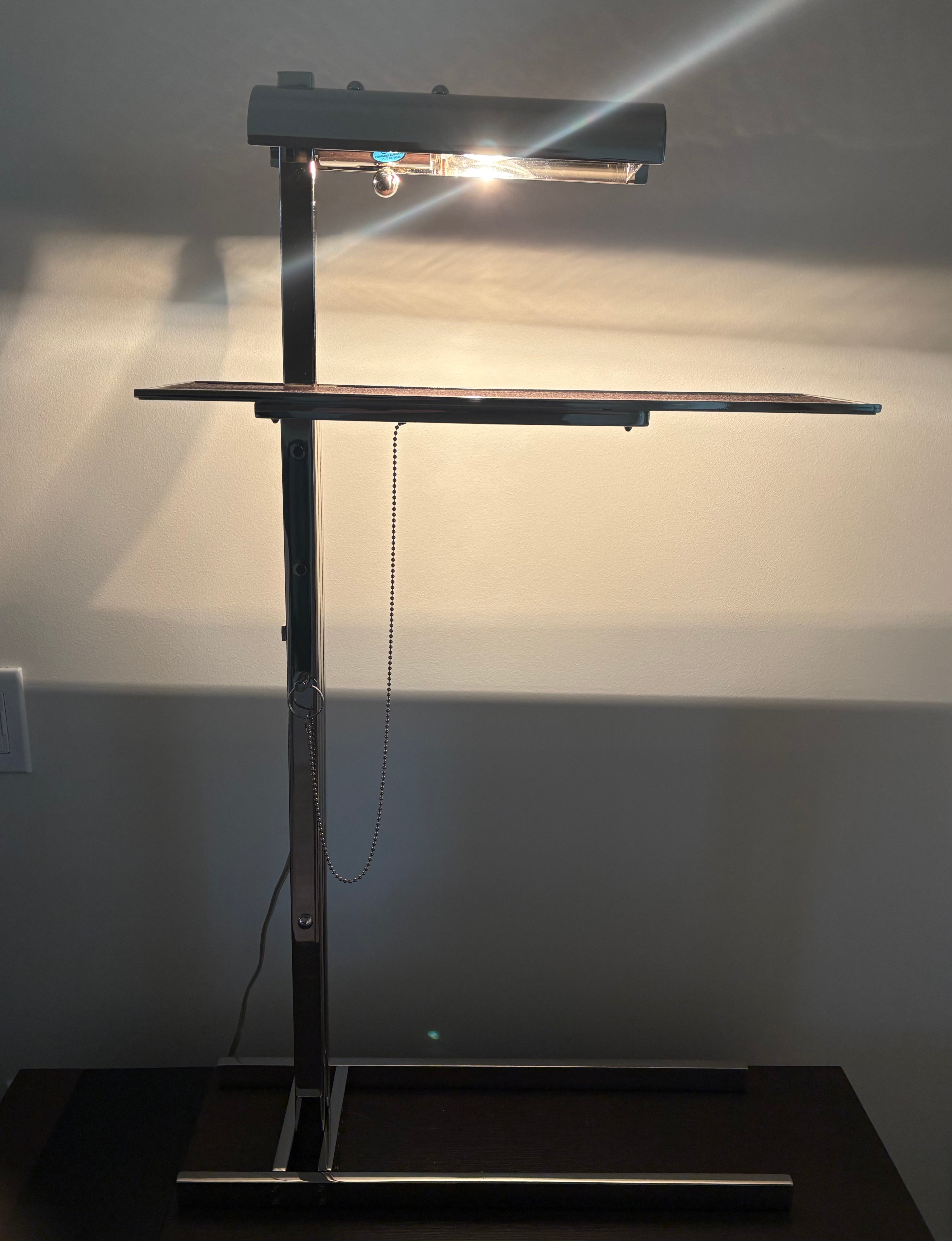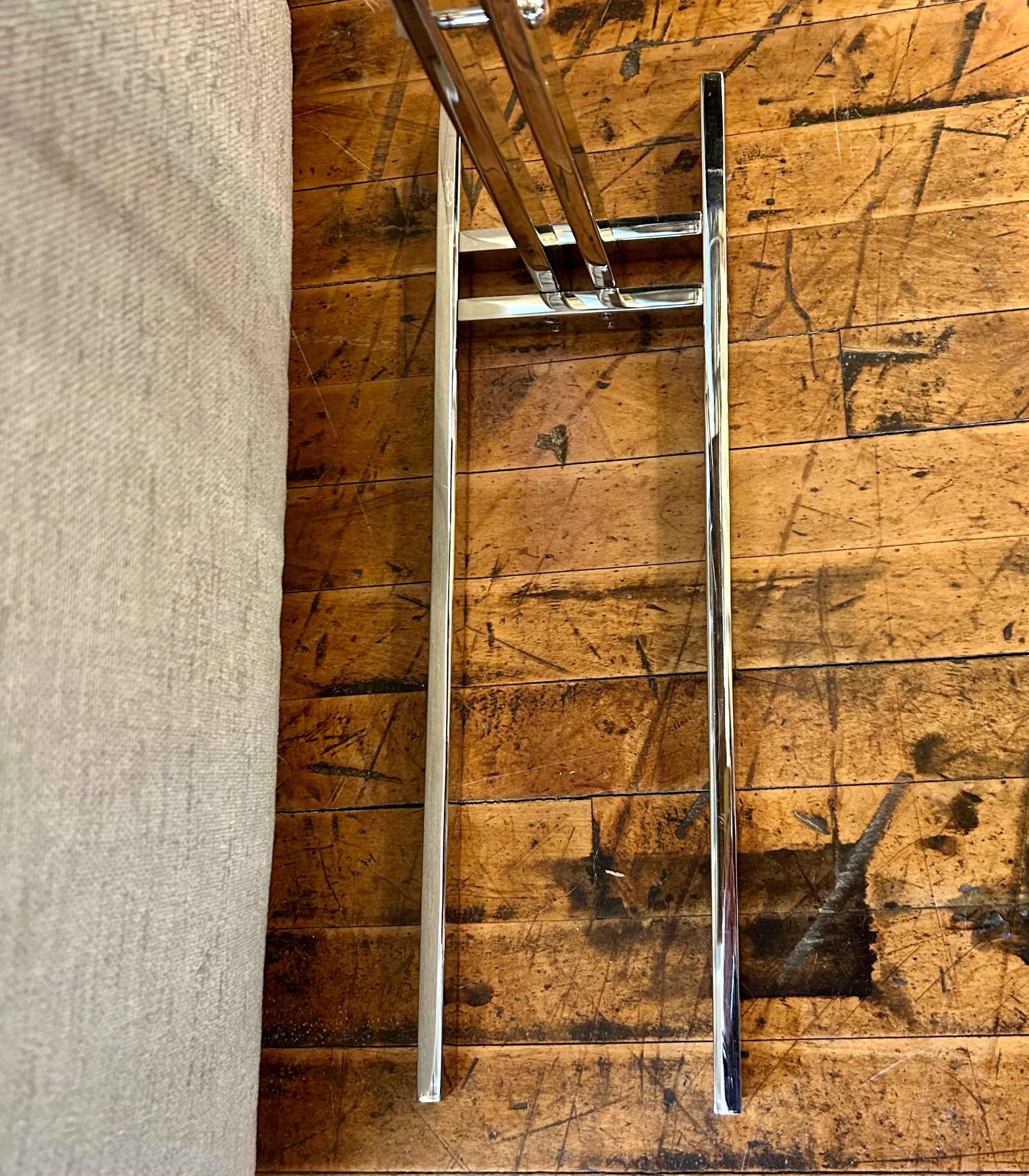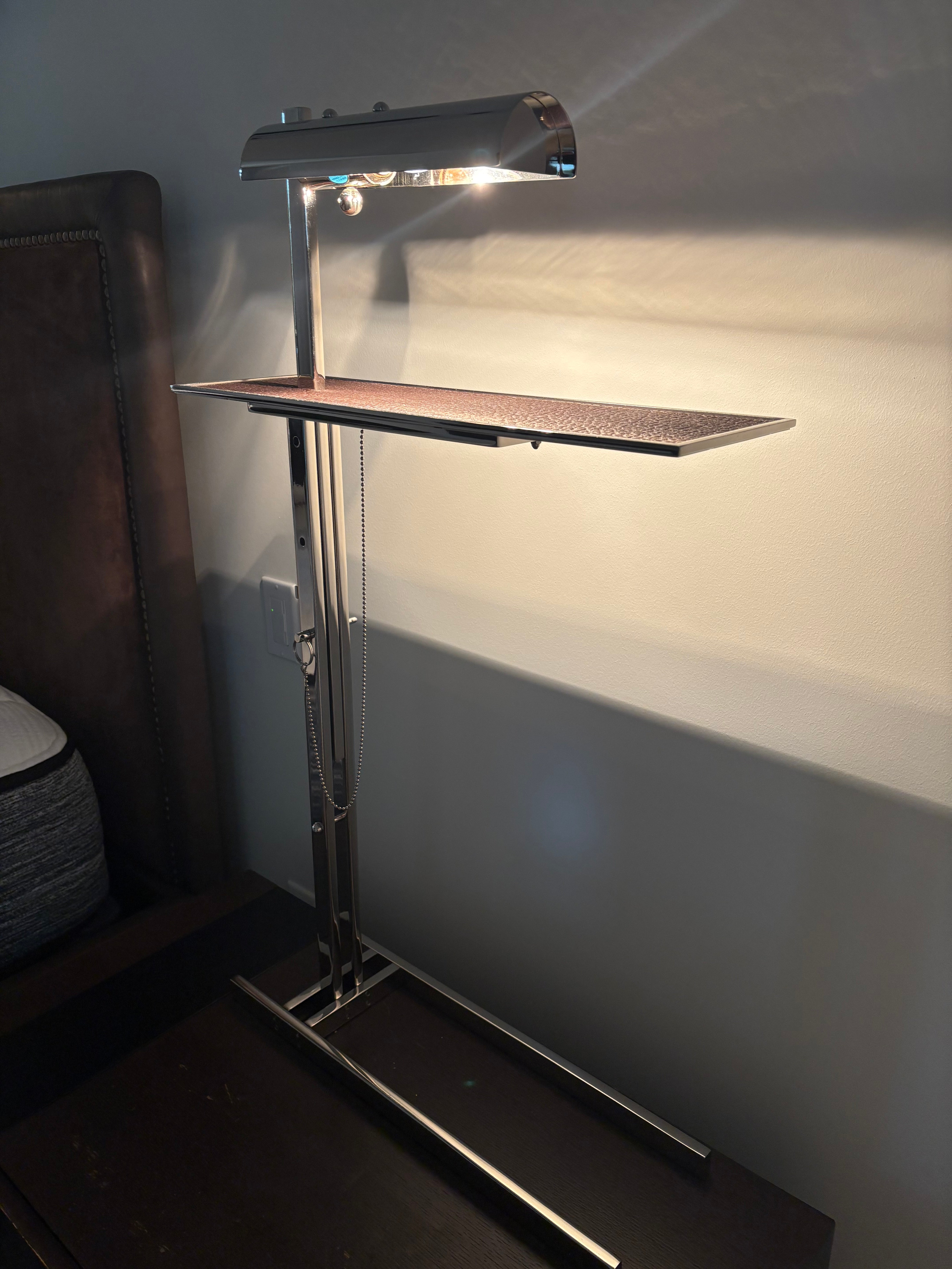 Floor lamp in chrome with leather serving tray. We do not have the maker name on this but it is of high quality and came out of an interior designed home in Vale, CO.