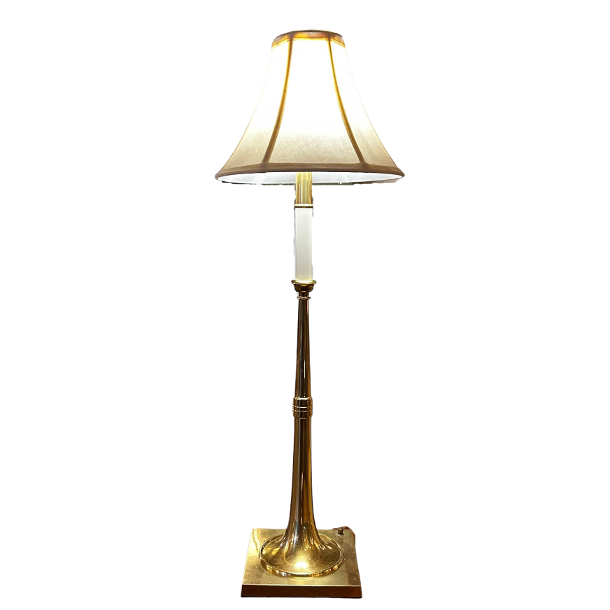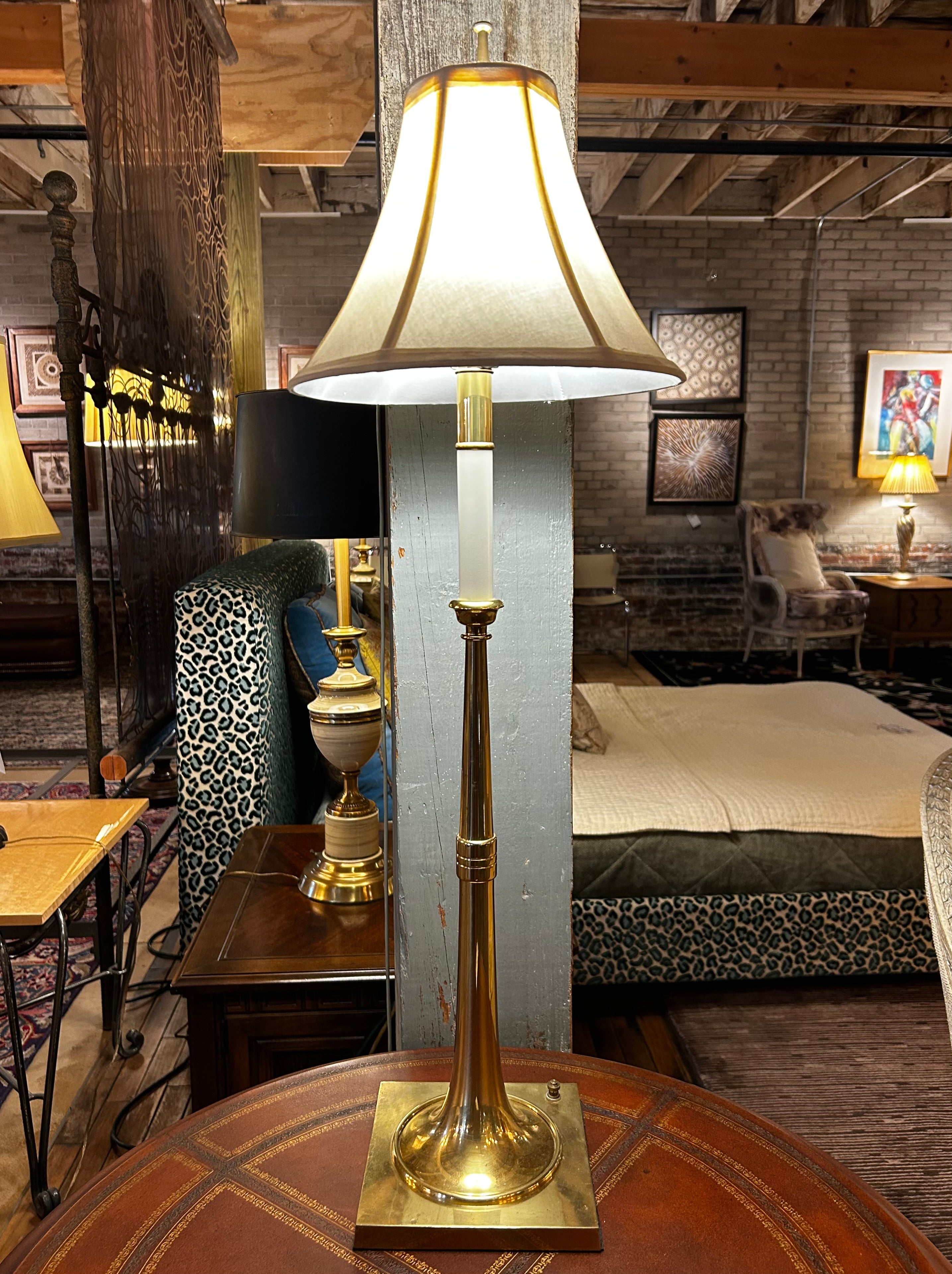 Table lamp, solid brass (we believe), candlestick top, trumpet shaped base, hunting horn. Traditional in style. Shade included.