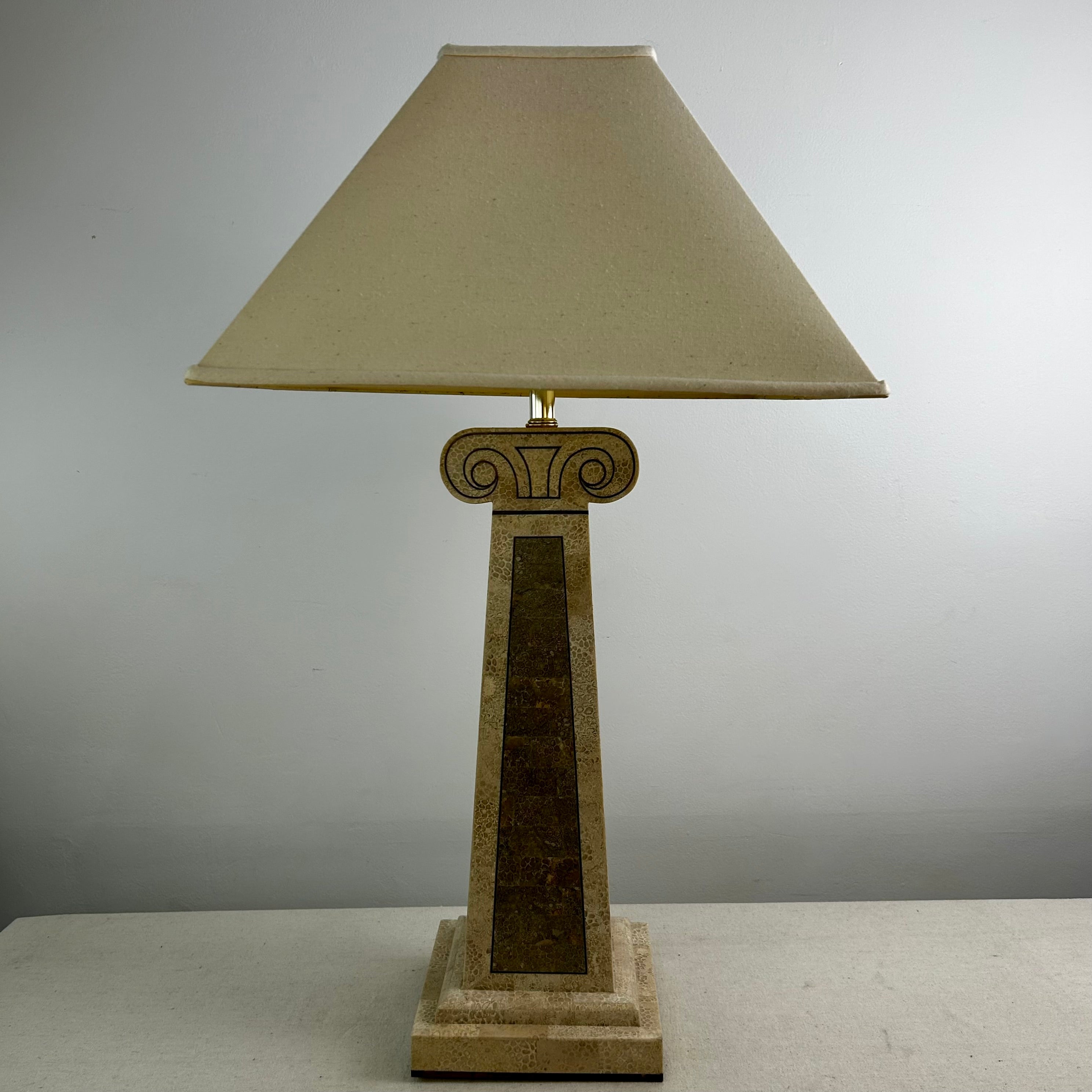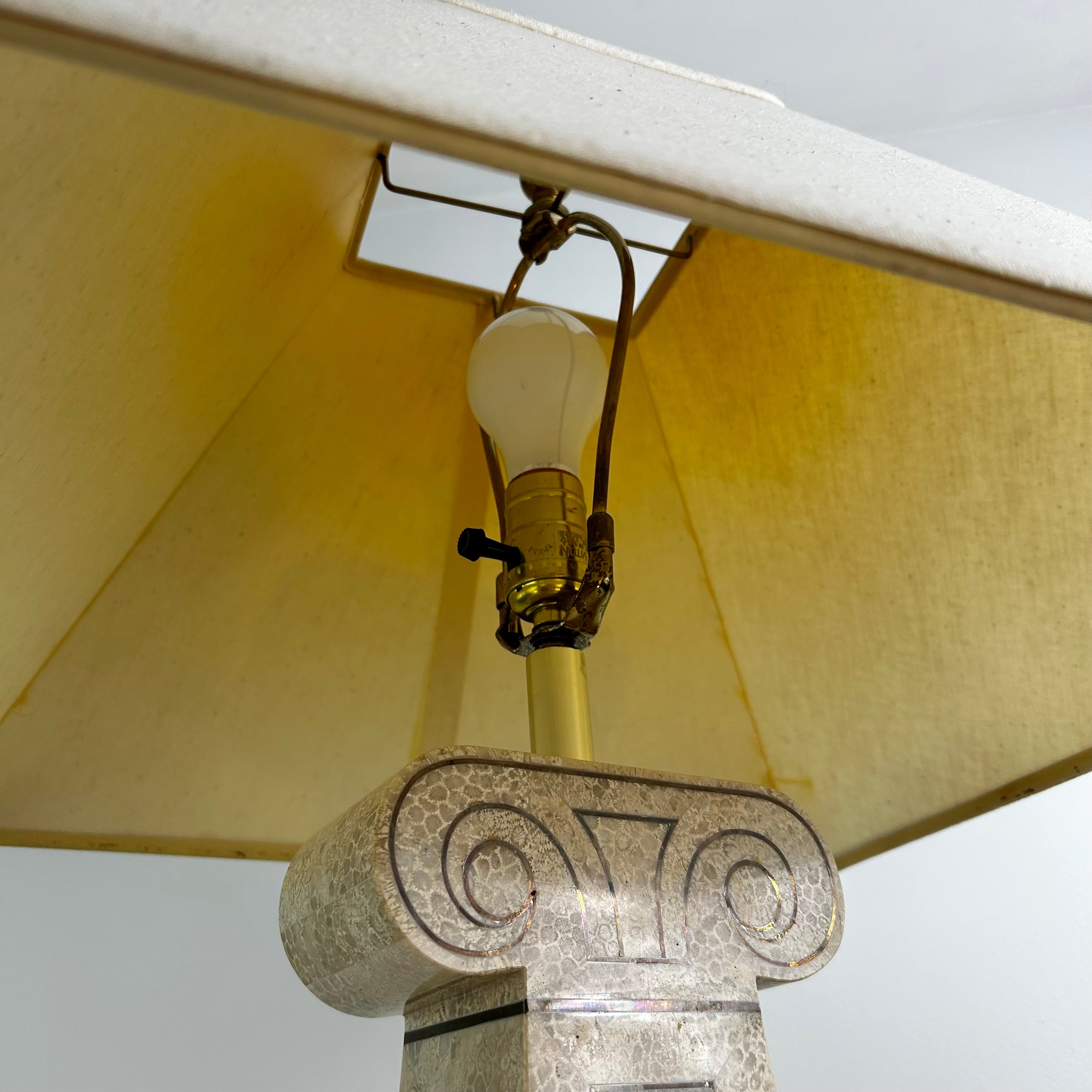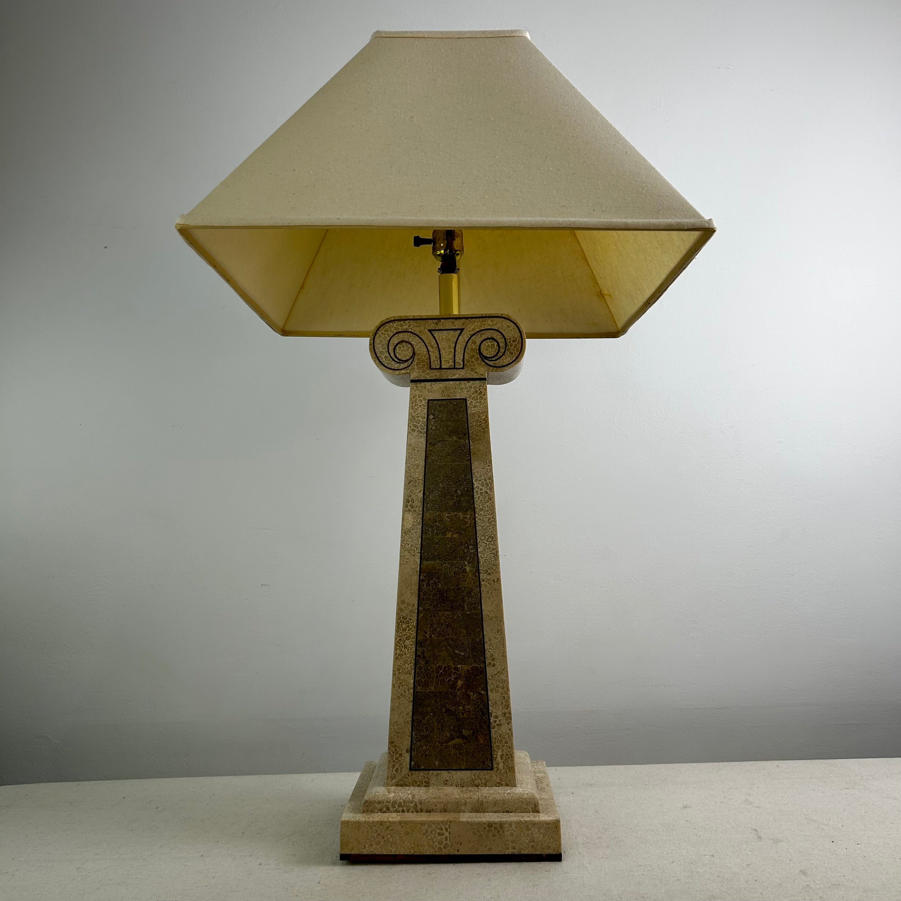 Table lamp in stone veneer column shaped with brass inlay and pyramid shaped shade.