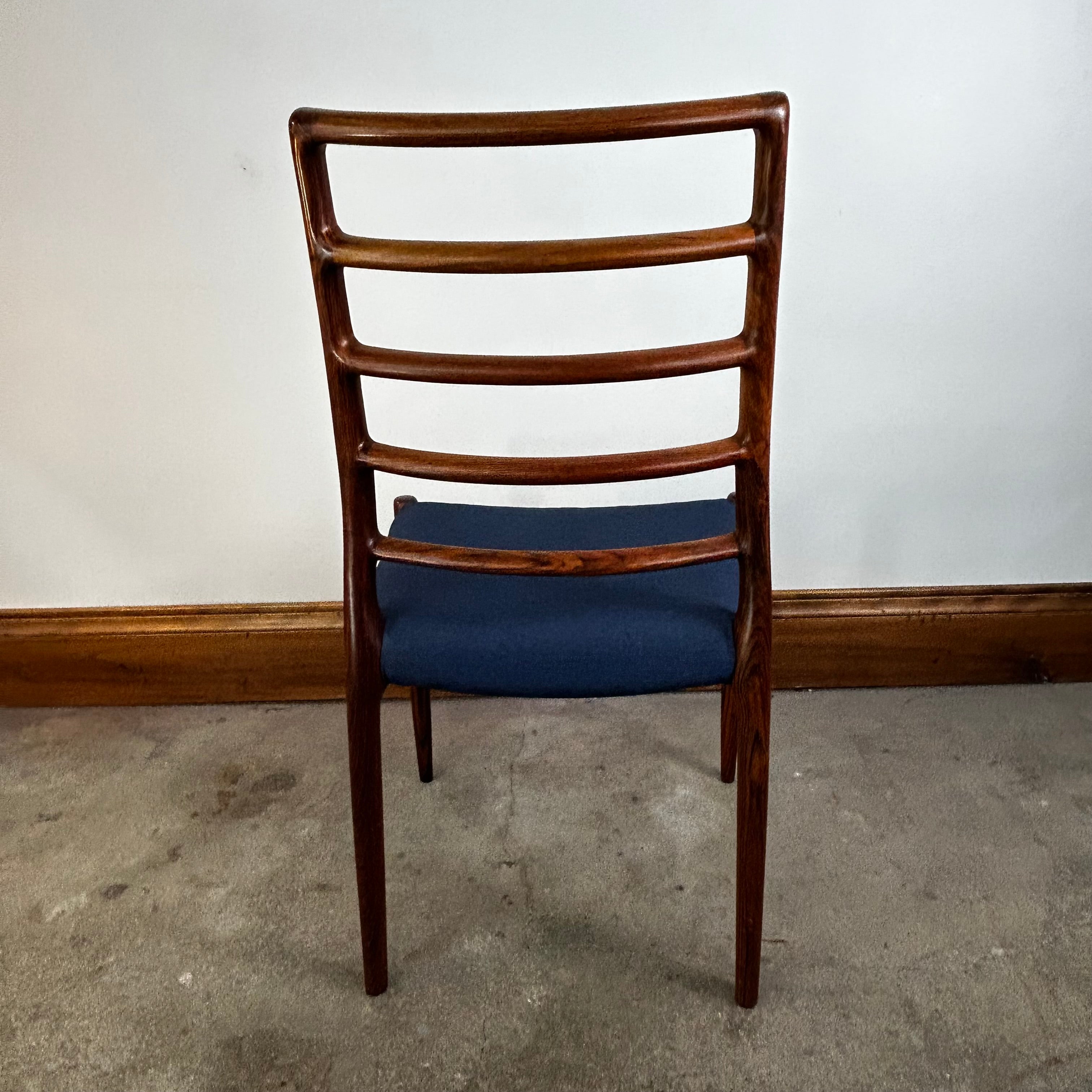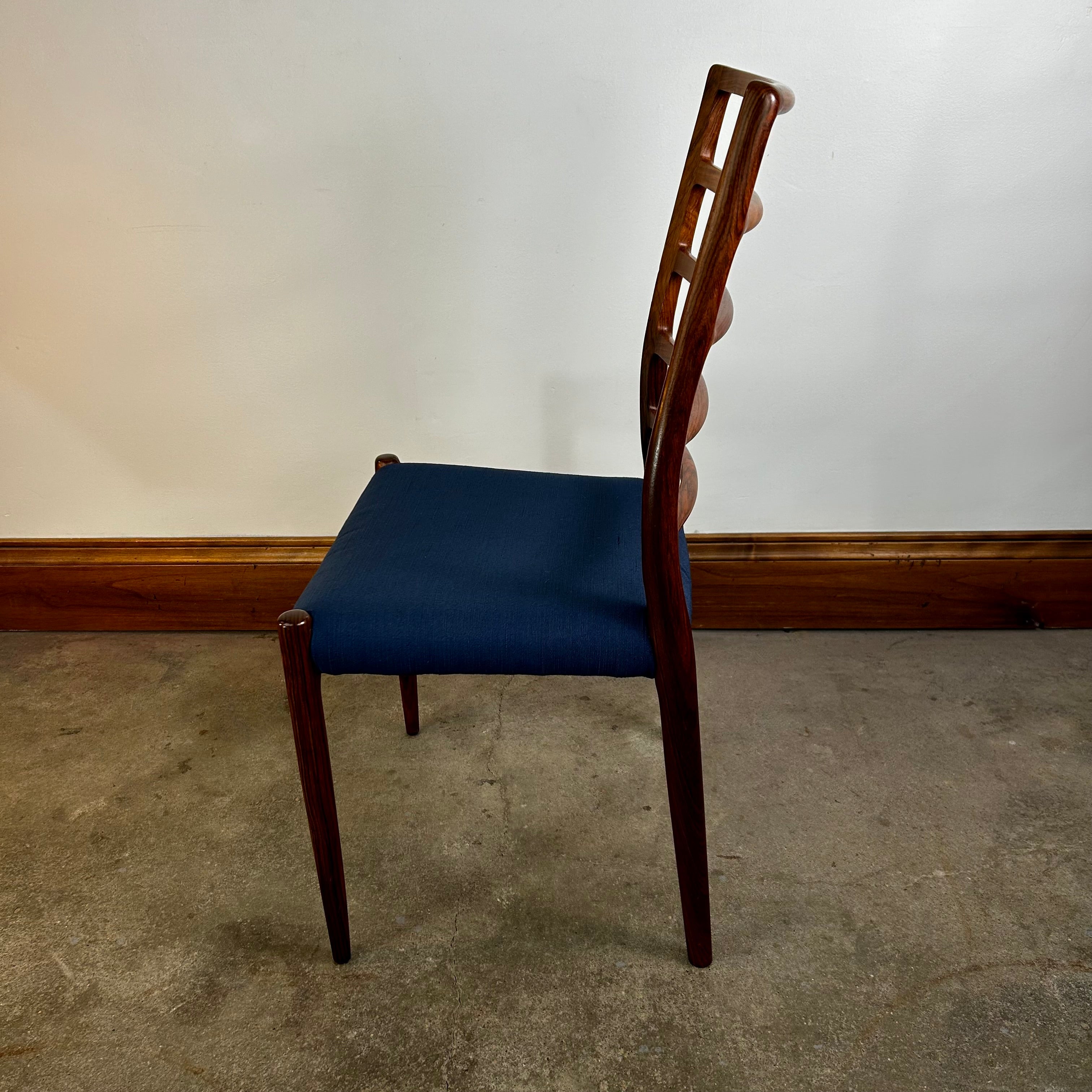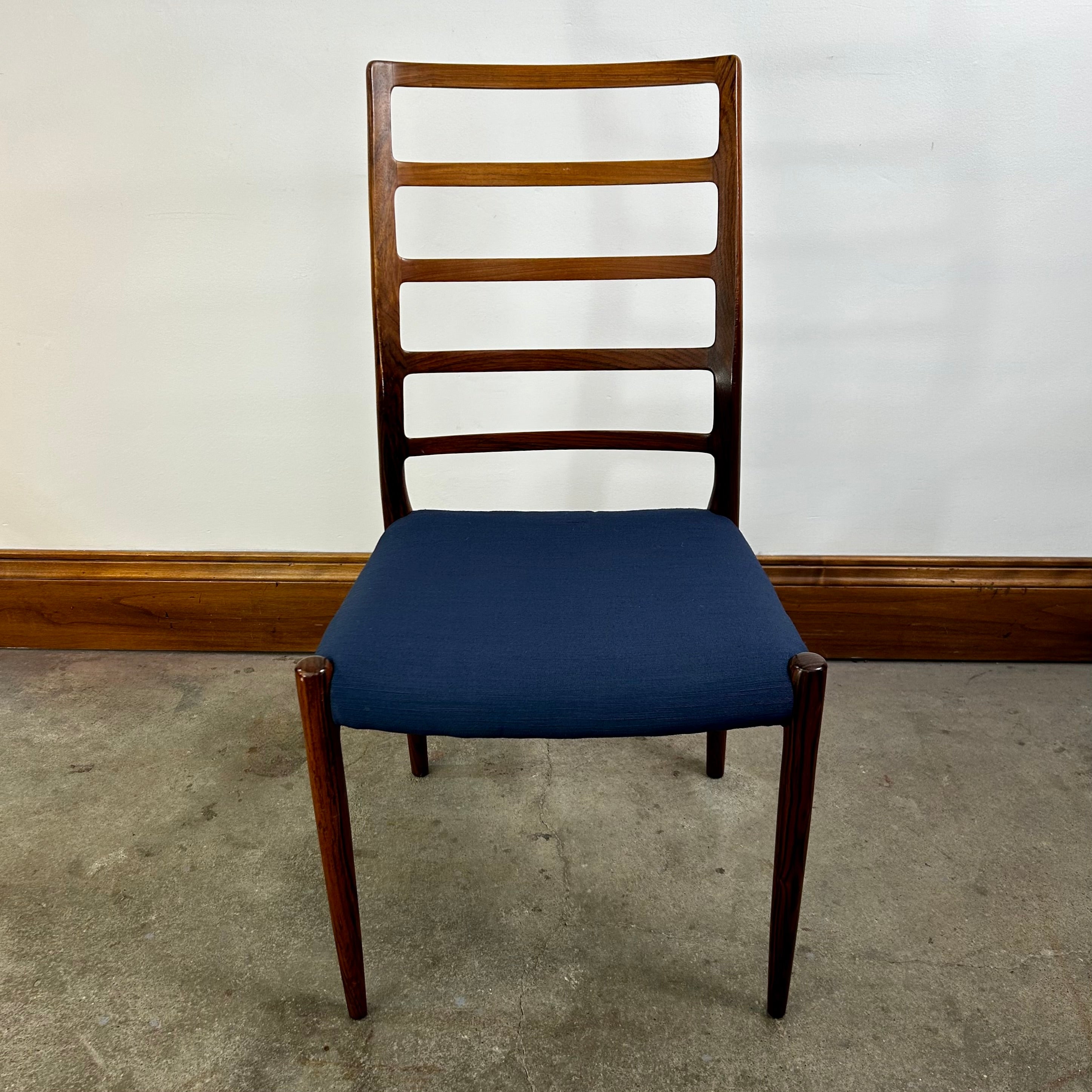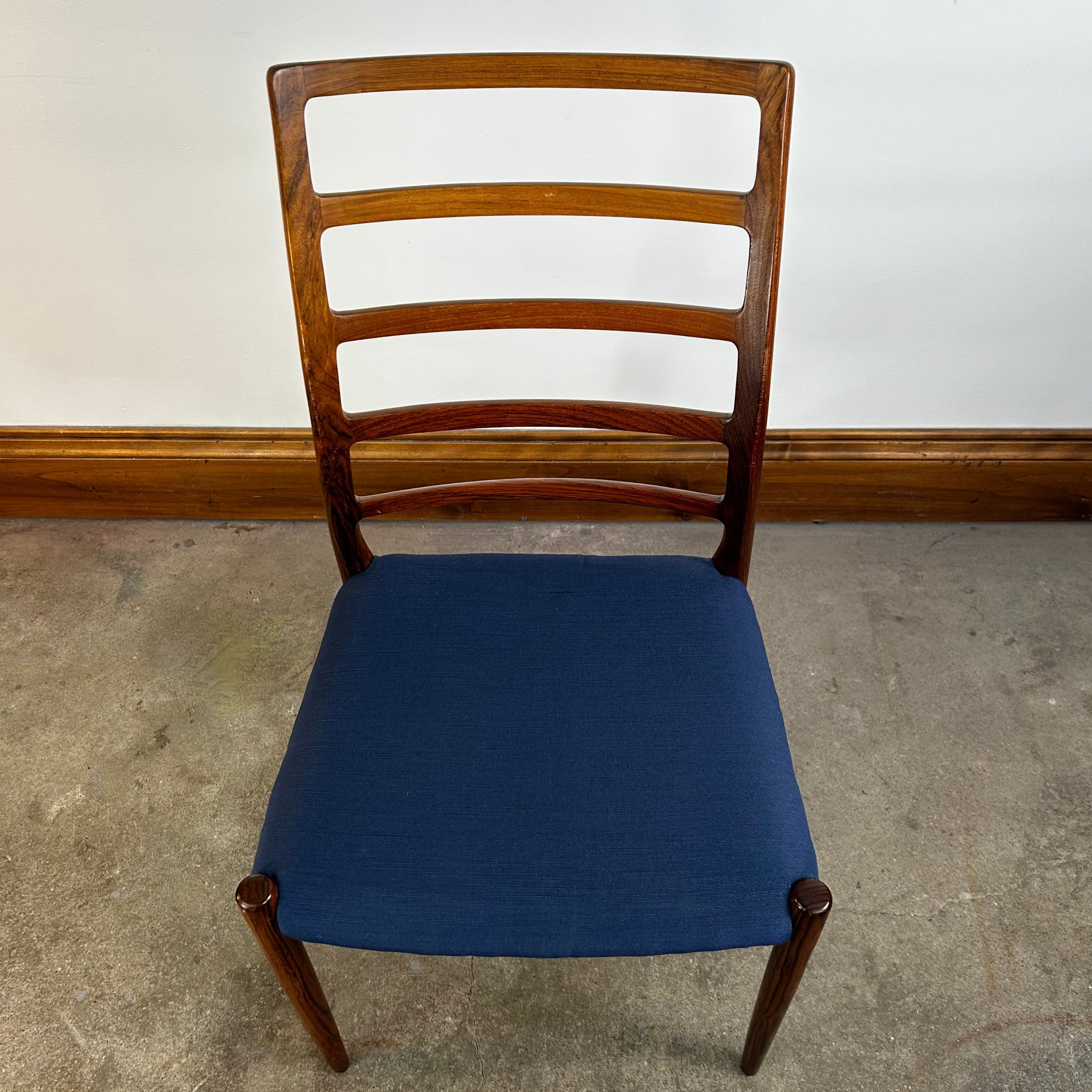 This elegant teak chair features a timeless vintage design, complete with five slats in the backrest and a beautiful upholstered blue seat.