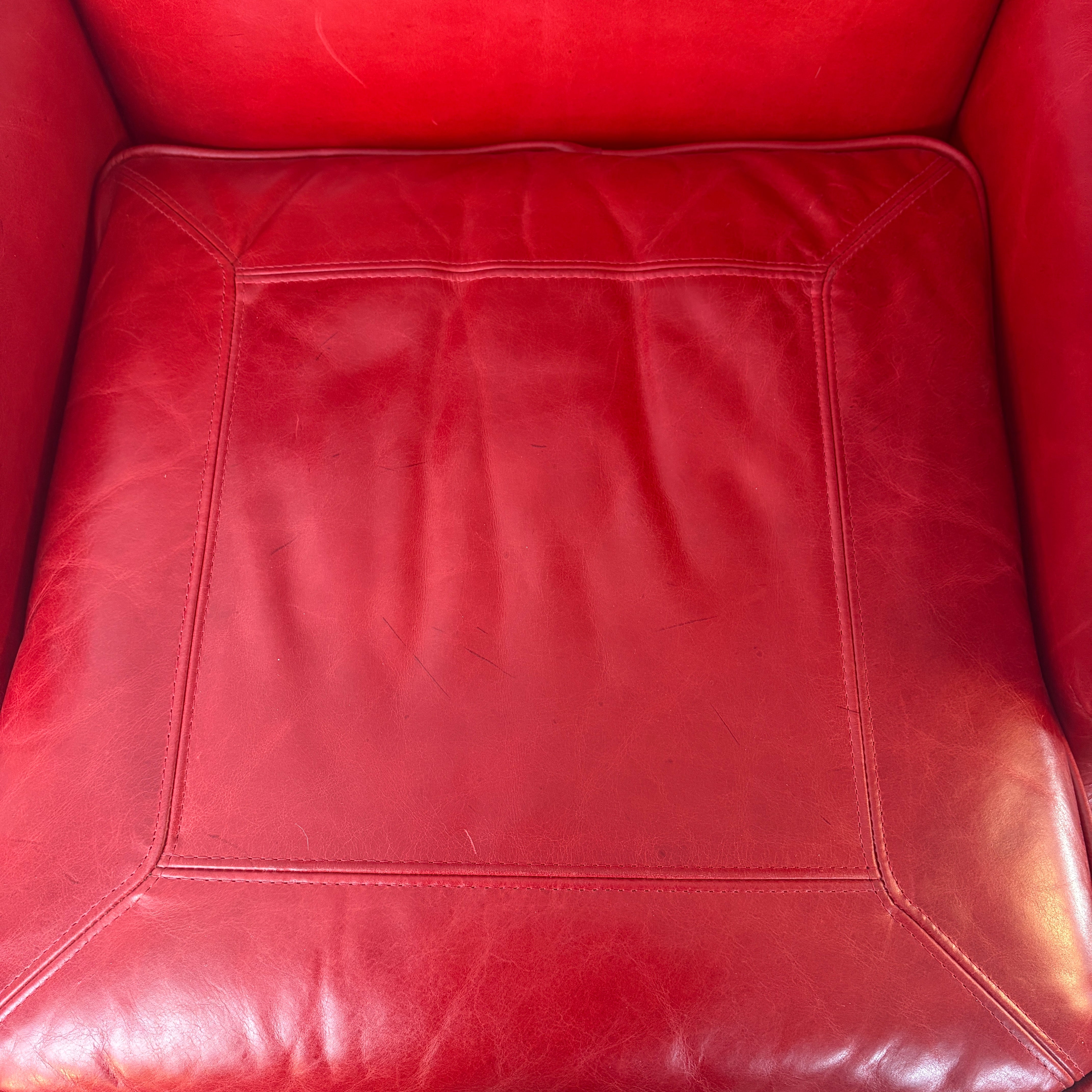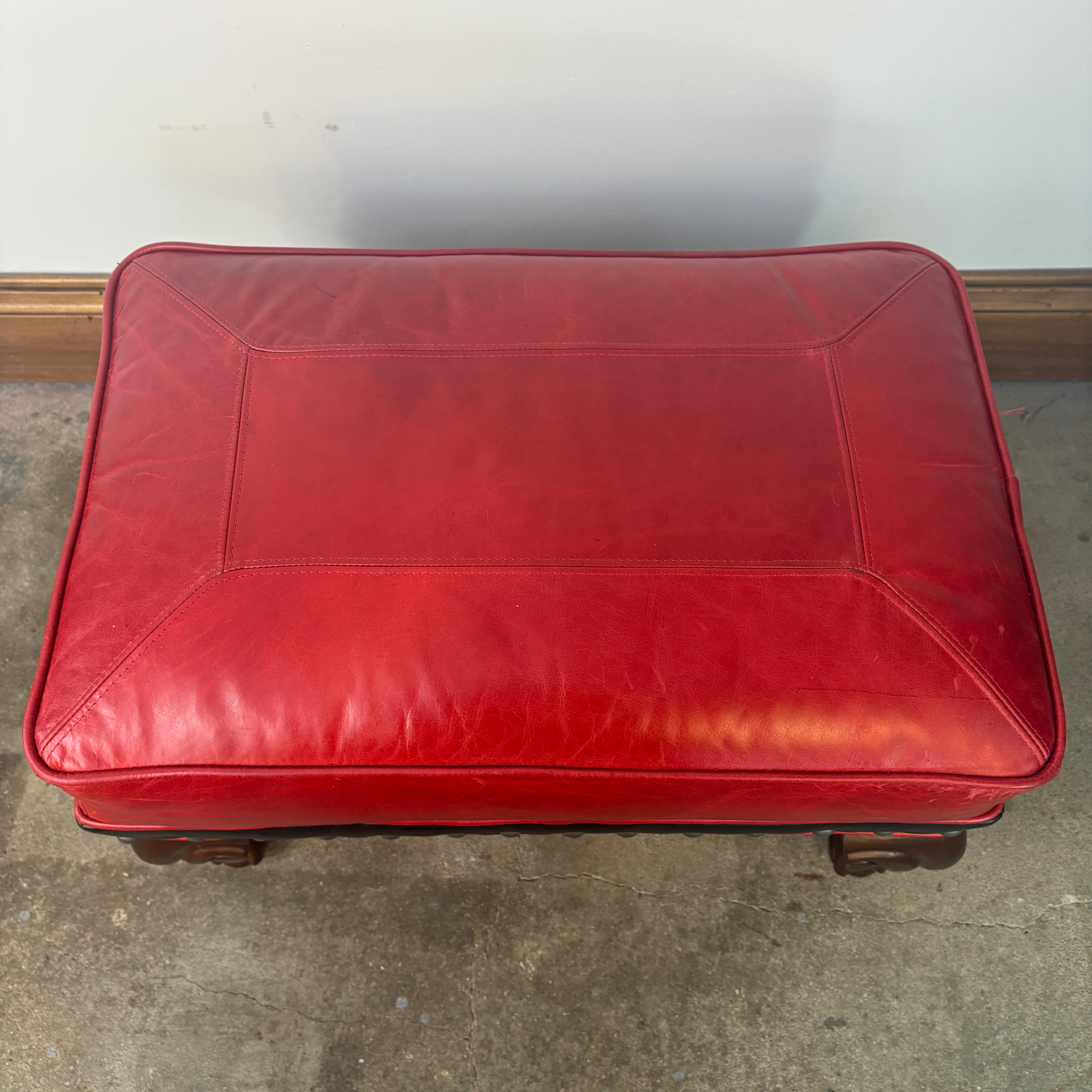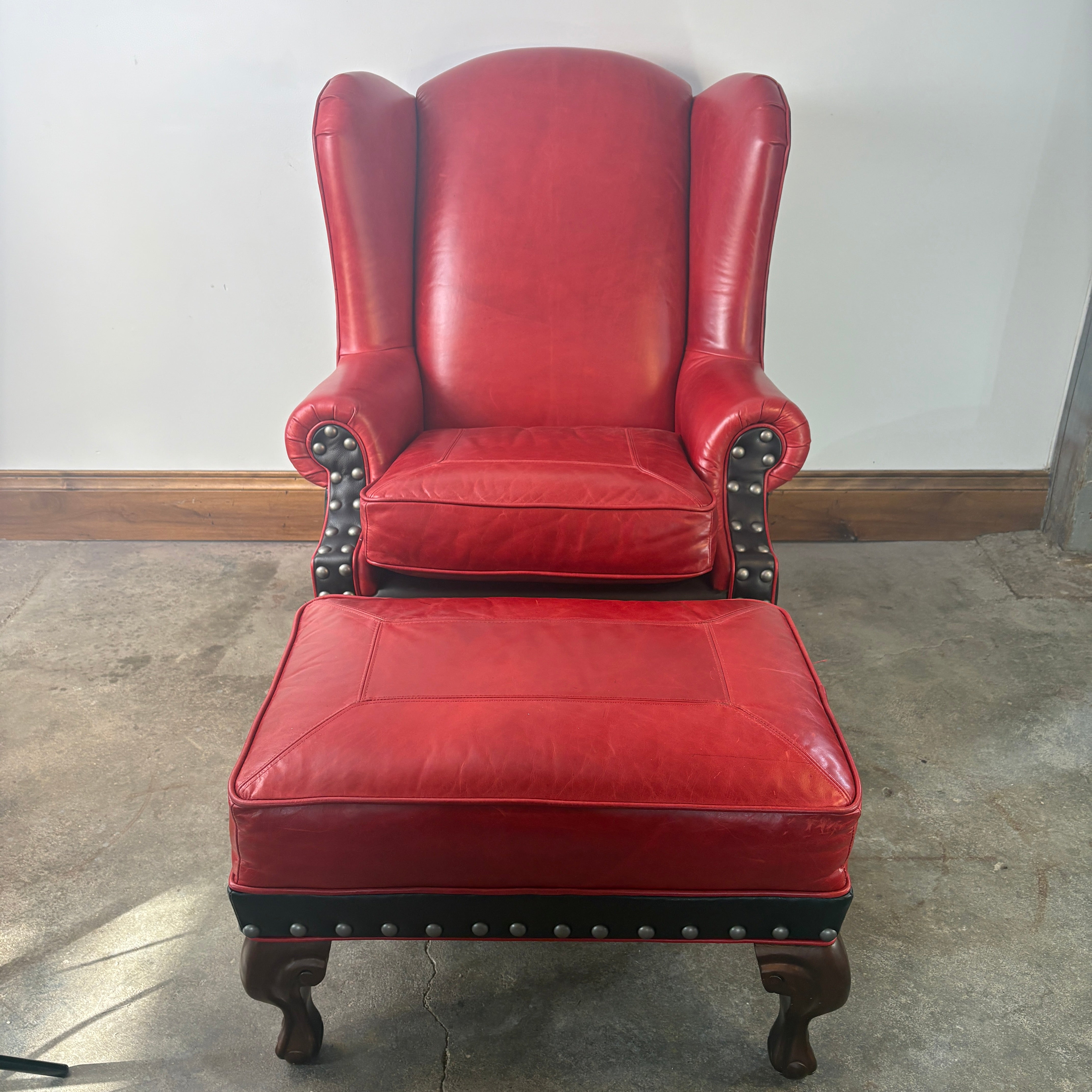 TLSC TEXAS Custom Upholstered Wing Chair and Ottoman Contrasting Red and Black Leather, Retail: $5295 OOTB price: $2900