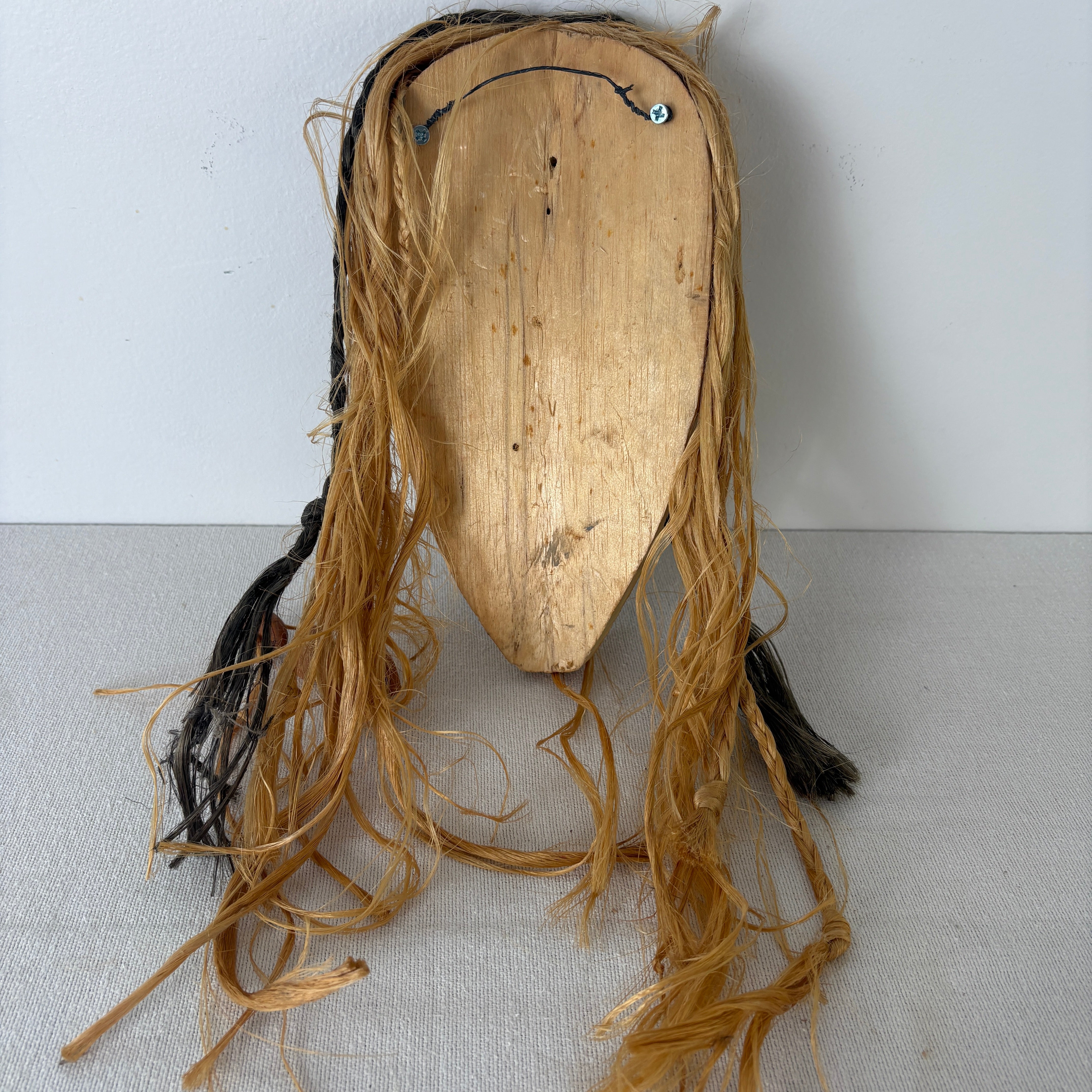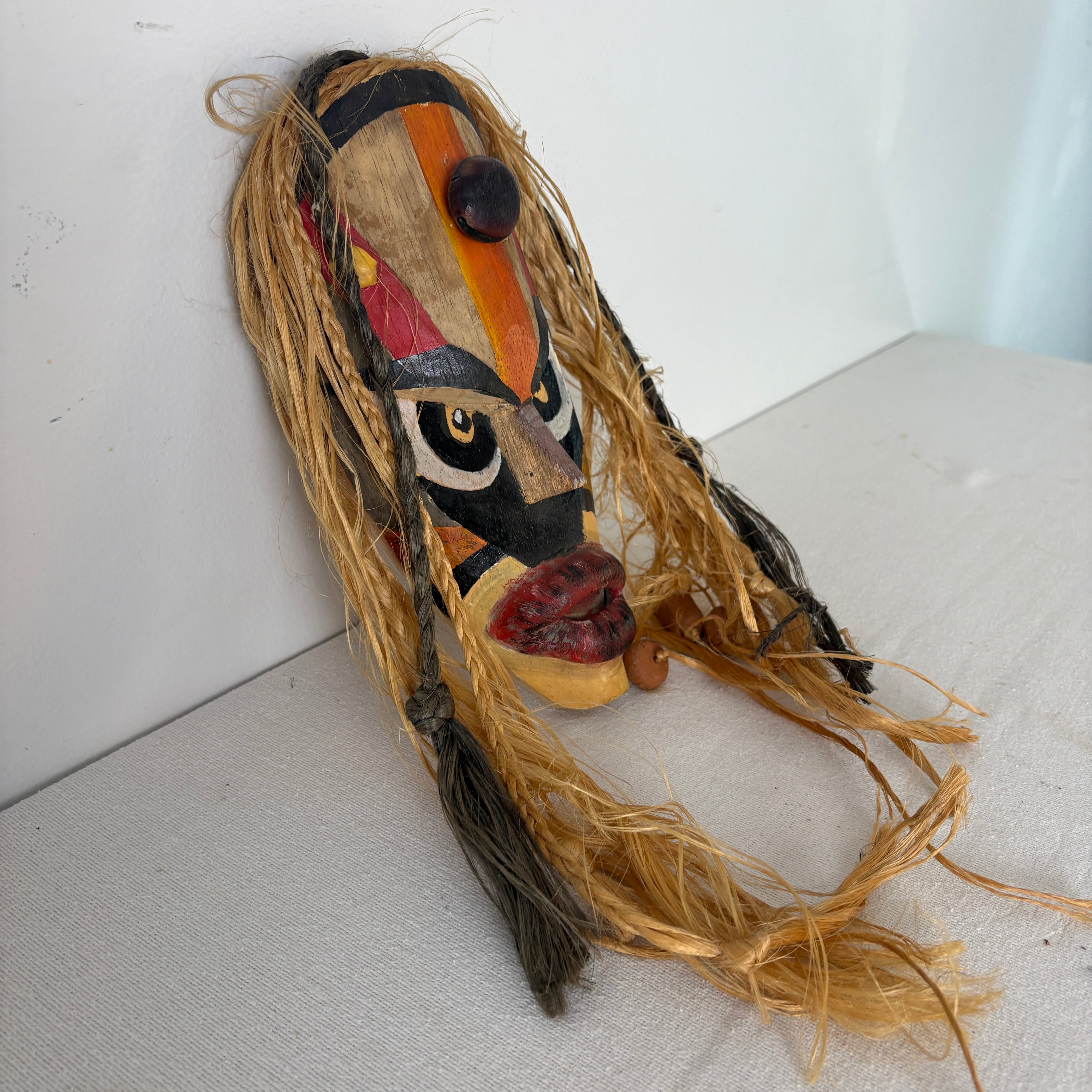 Wood Tribal Mask, Painted with Raffia Hair, Vintage.