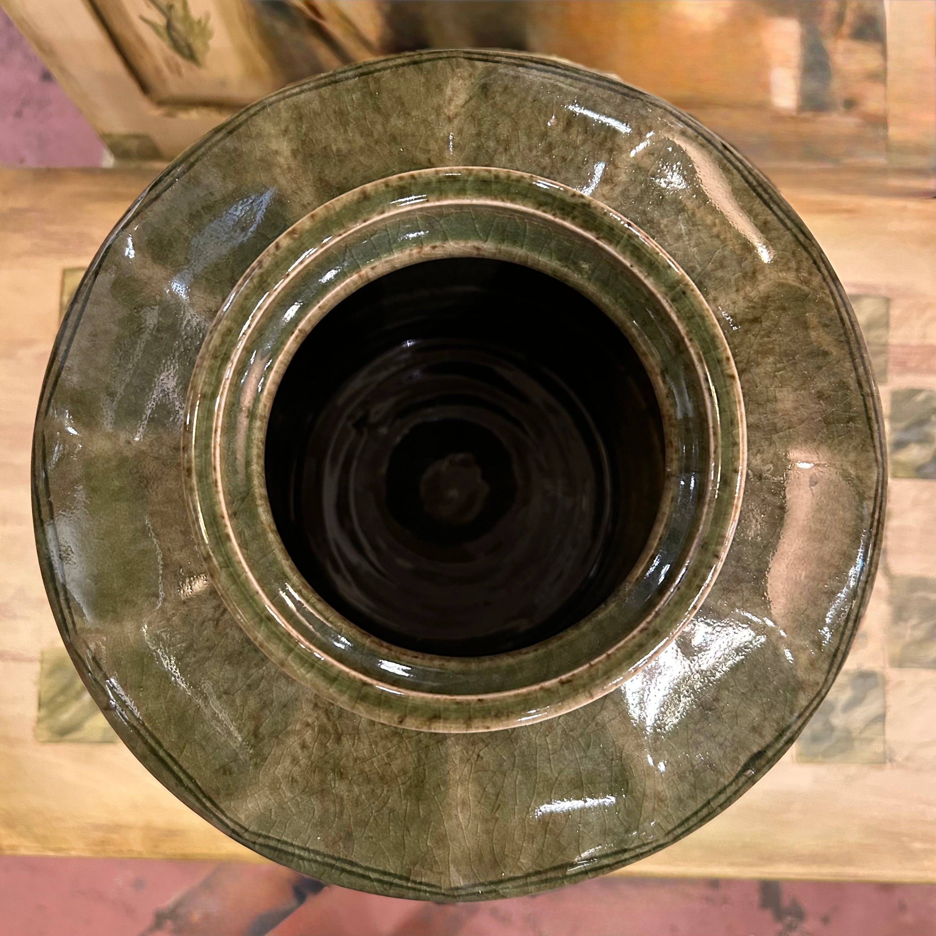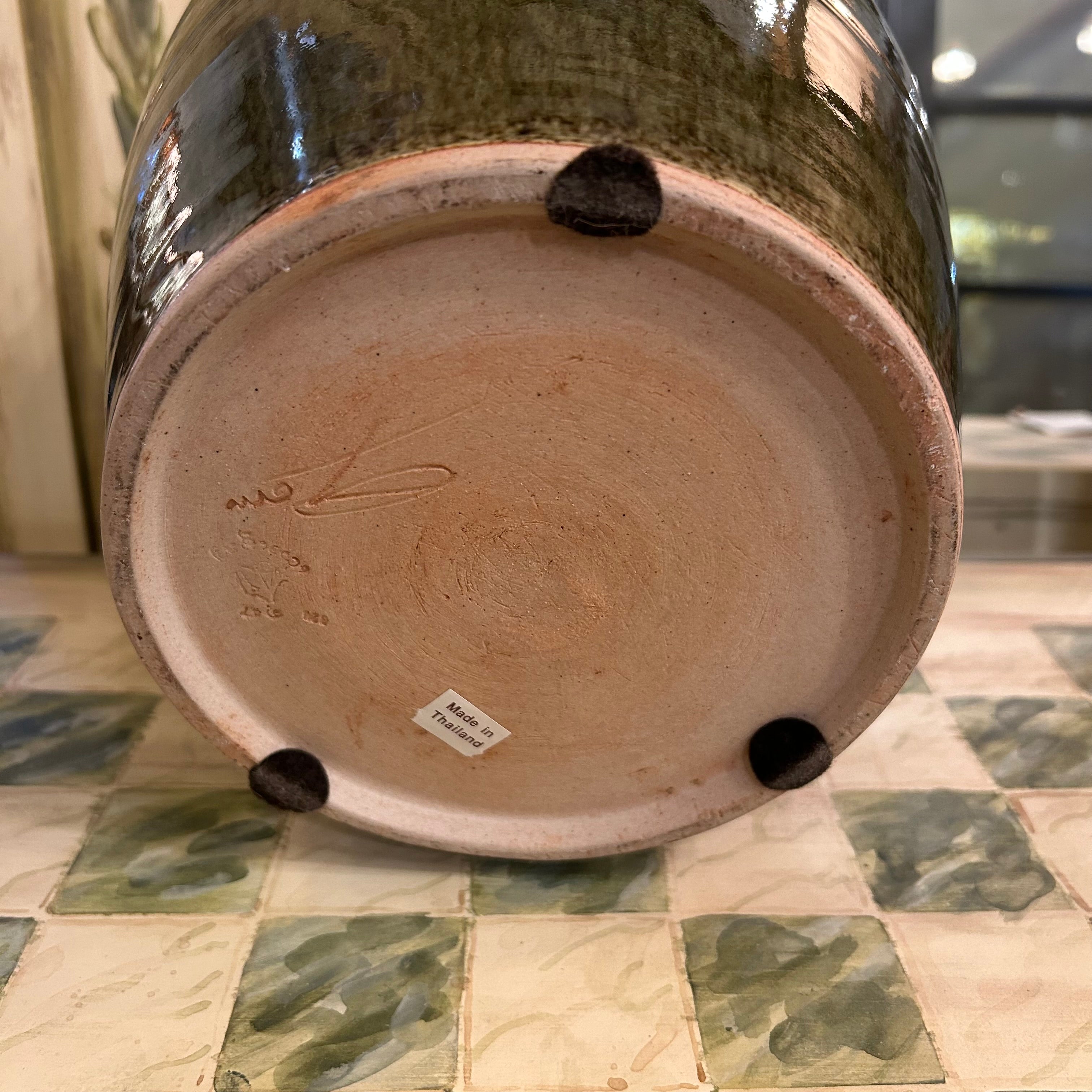 Ceramic Vase, Olive Green, Crackle Finish, Artist Signed, Possibly by Maitland Smith. Made in Thailand.