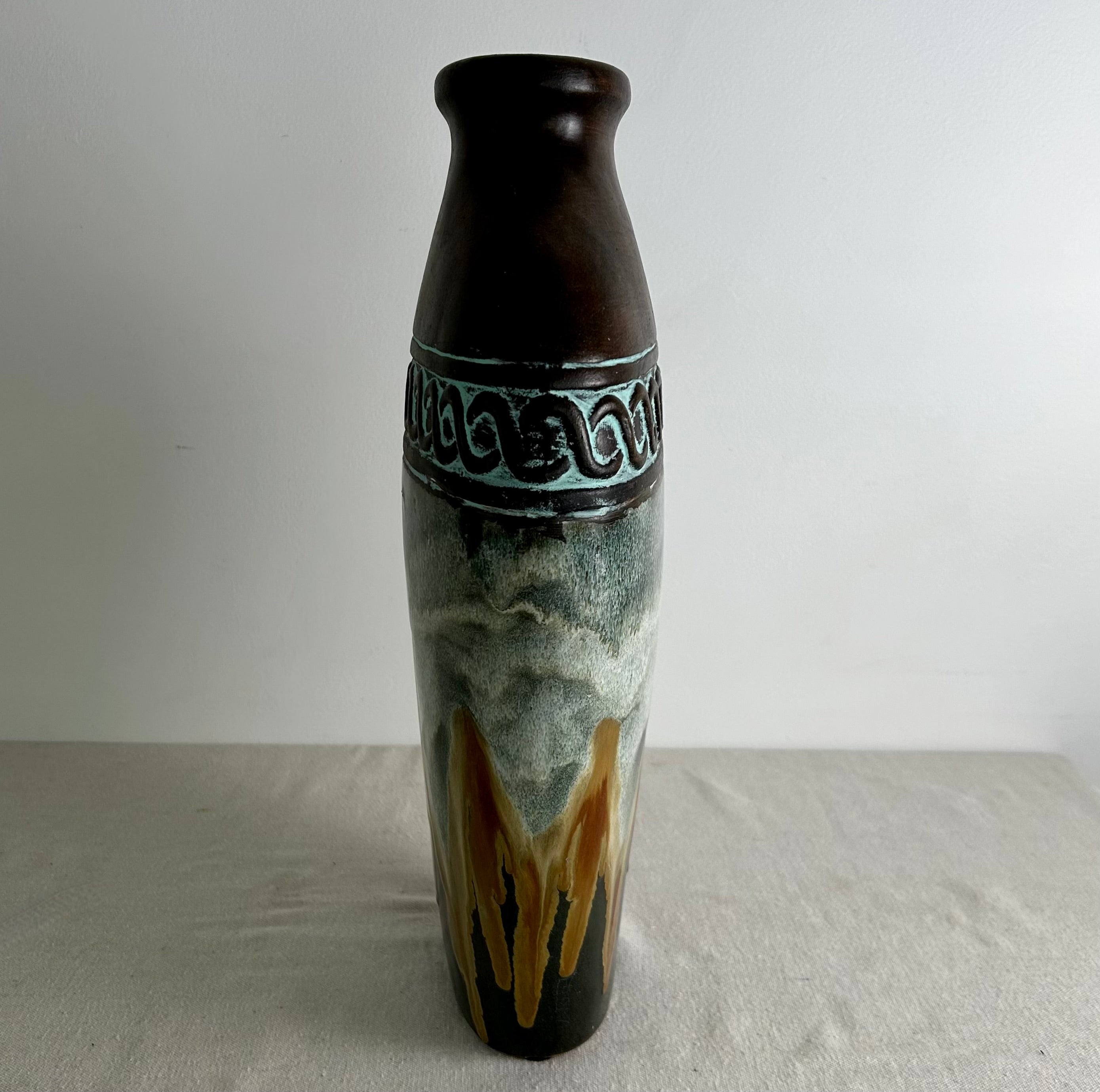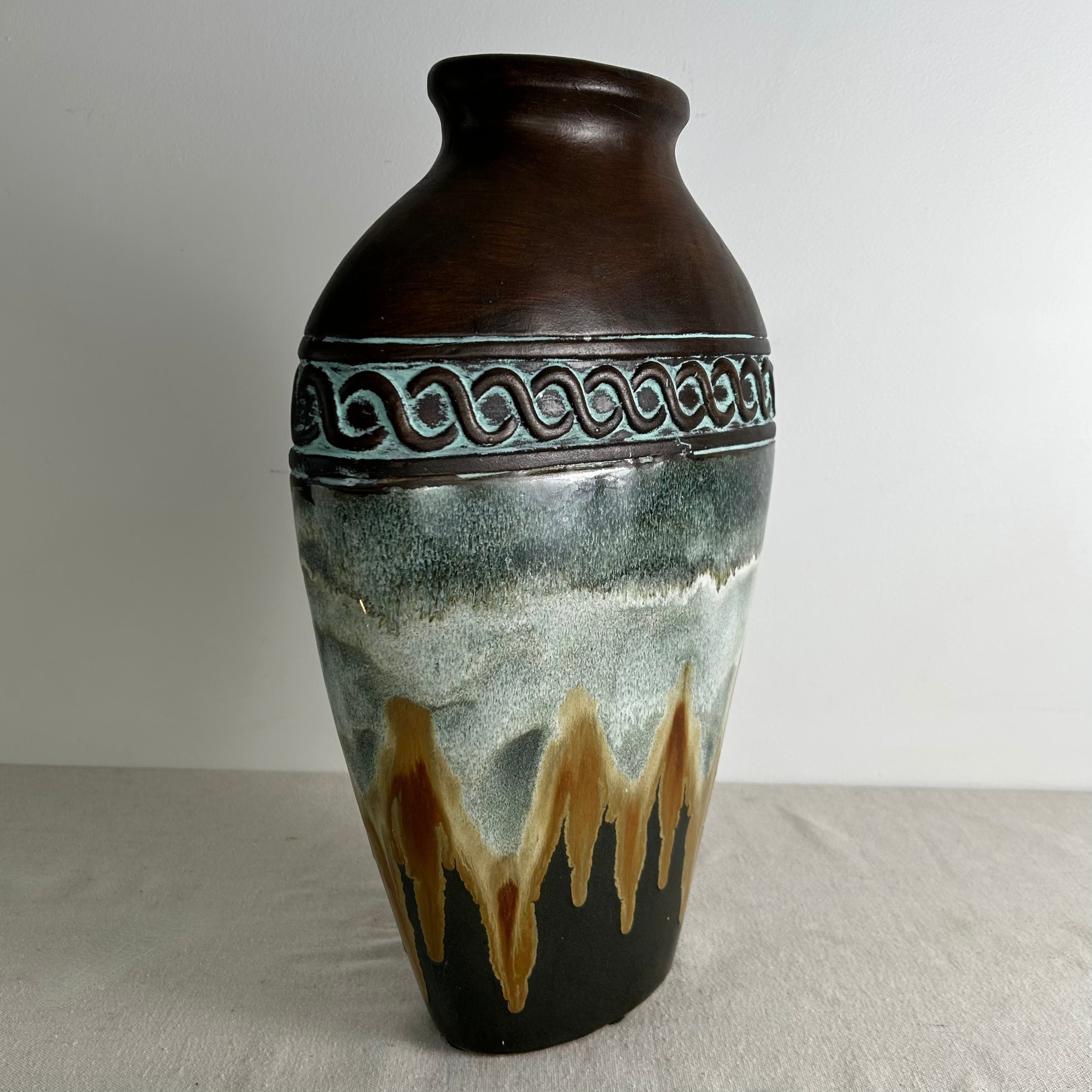 Oval vase, ceramic, tall with shades of brown, rust, cream and brown. Unsigned.