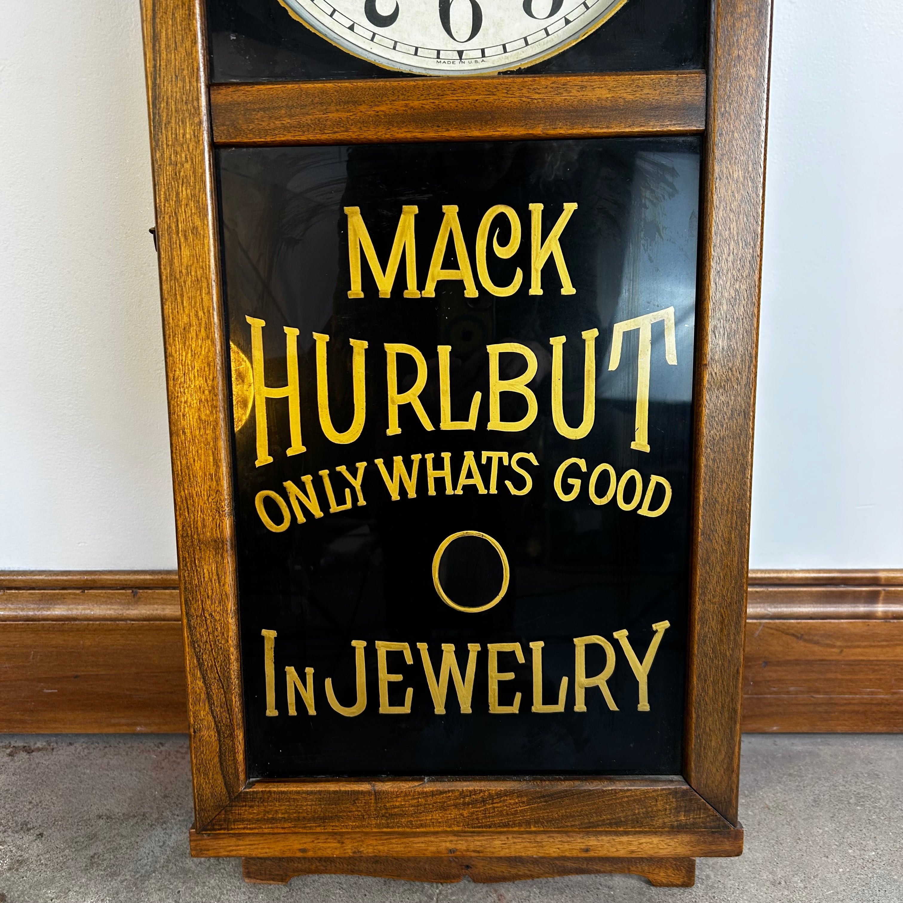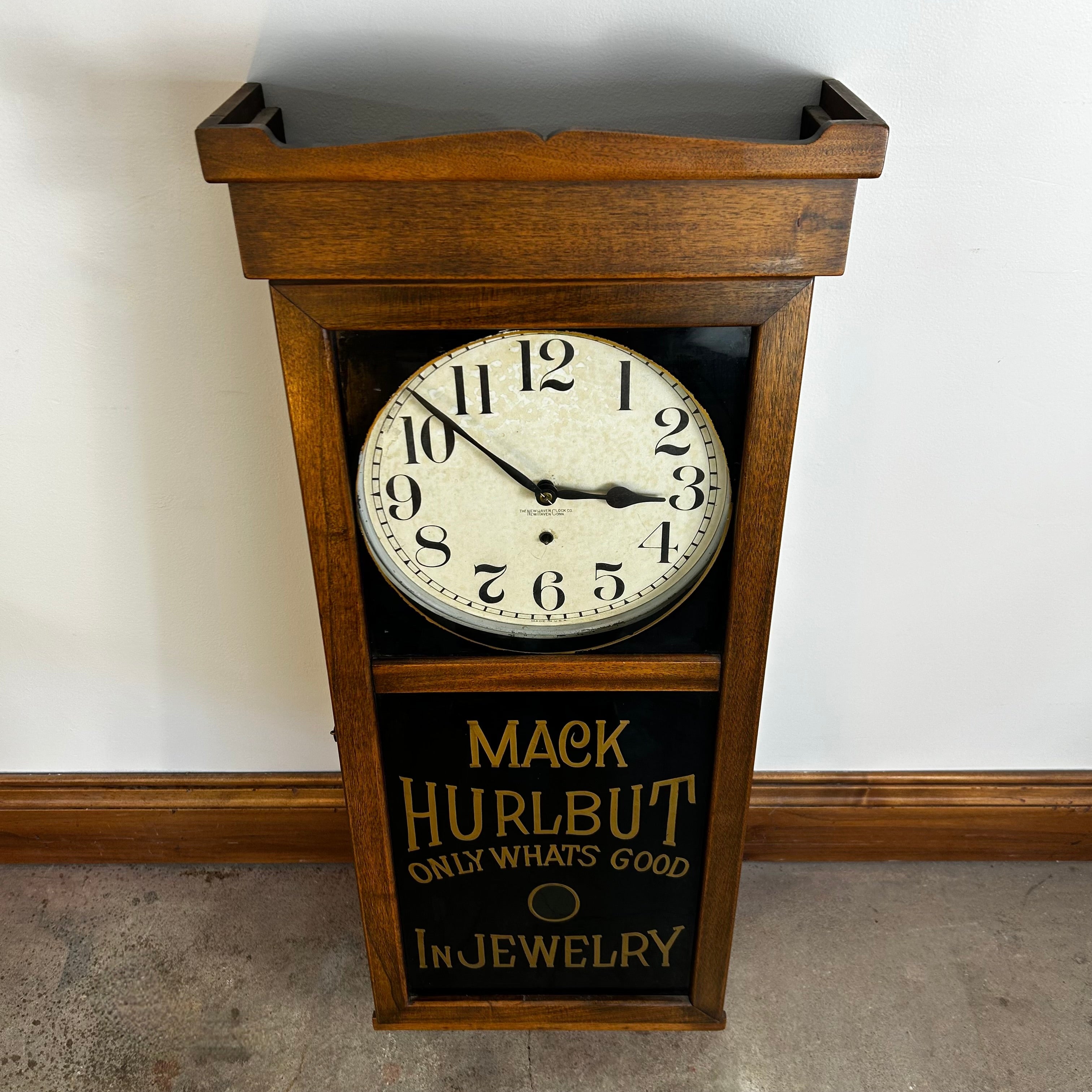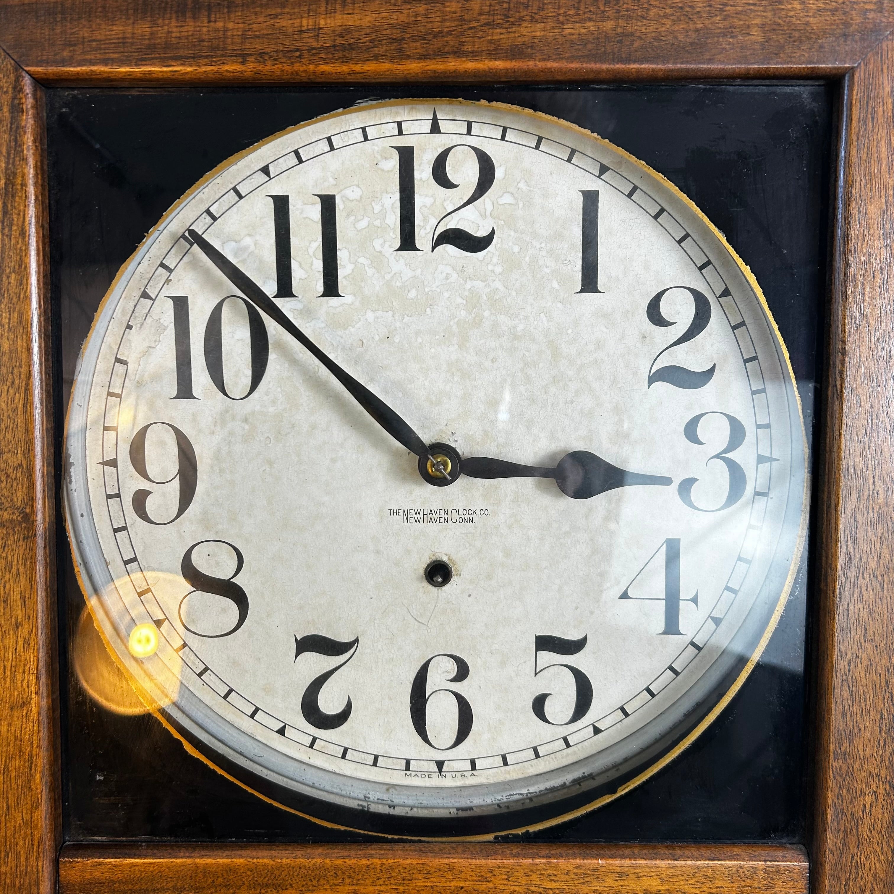 Wall clock, Mack Hurlbut, New Haven Clock Co., New Haven, Conn., vintage, wood, frame wight glass door.