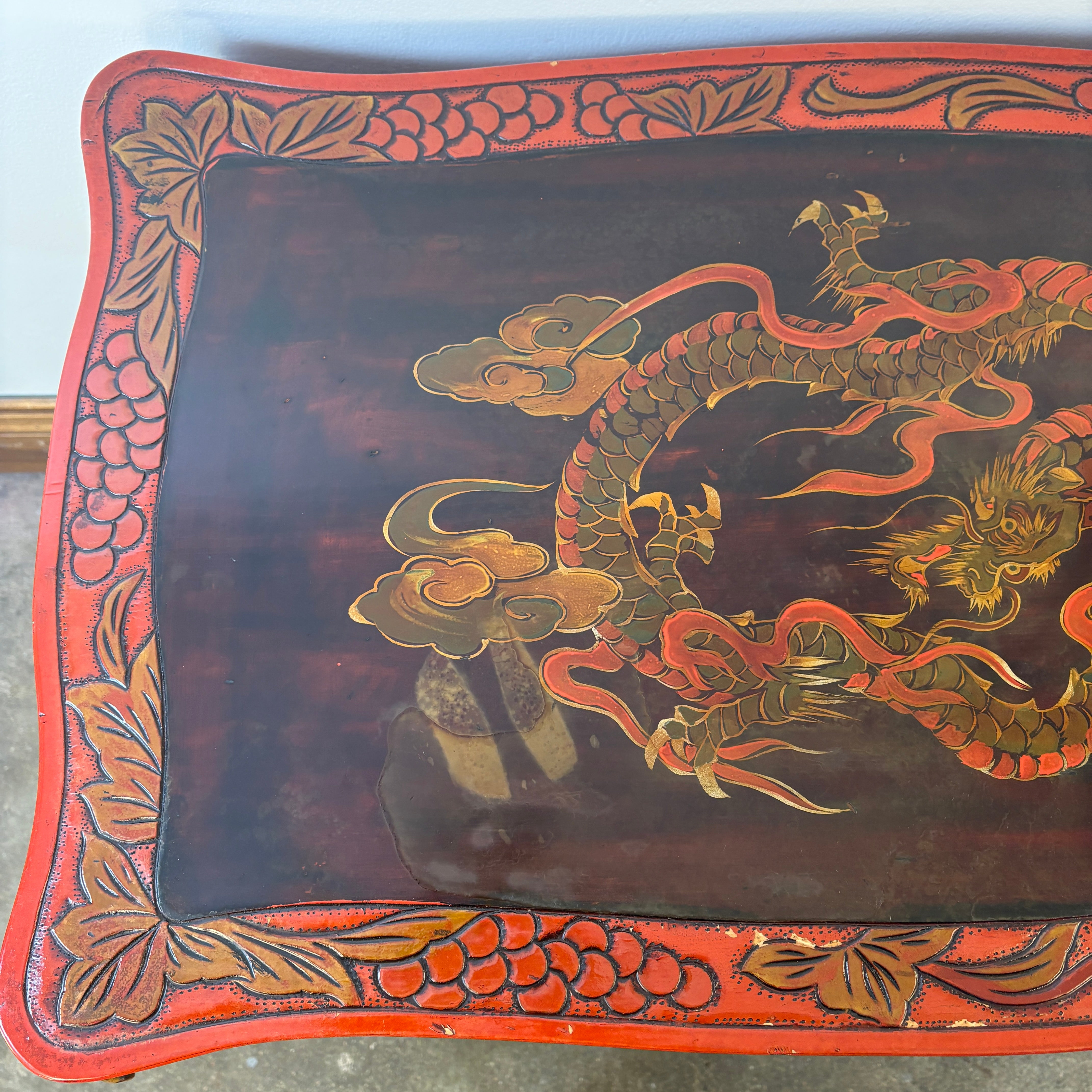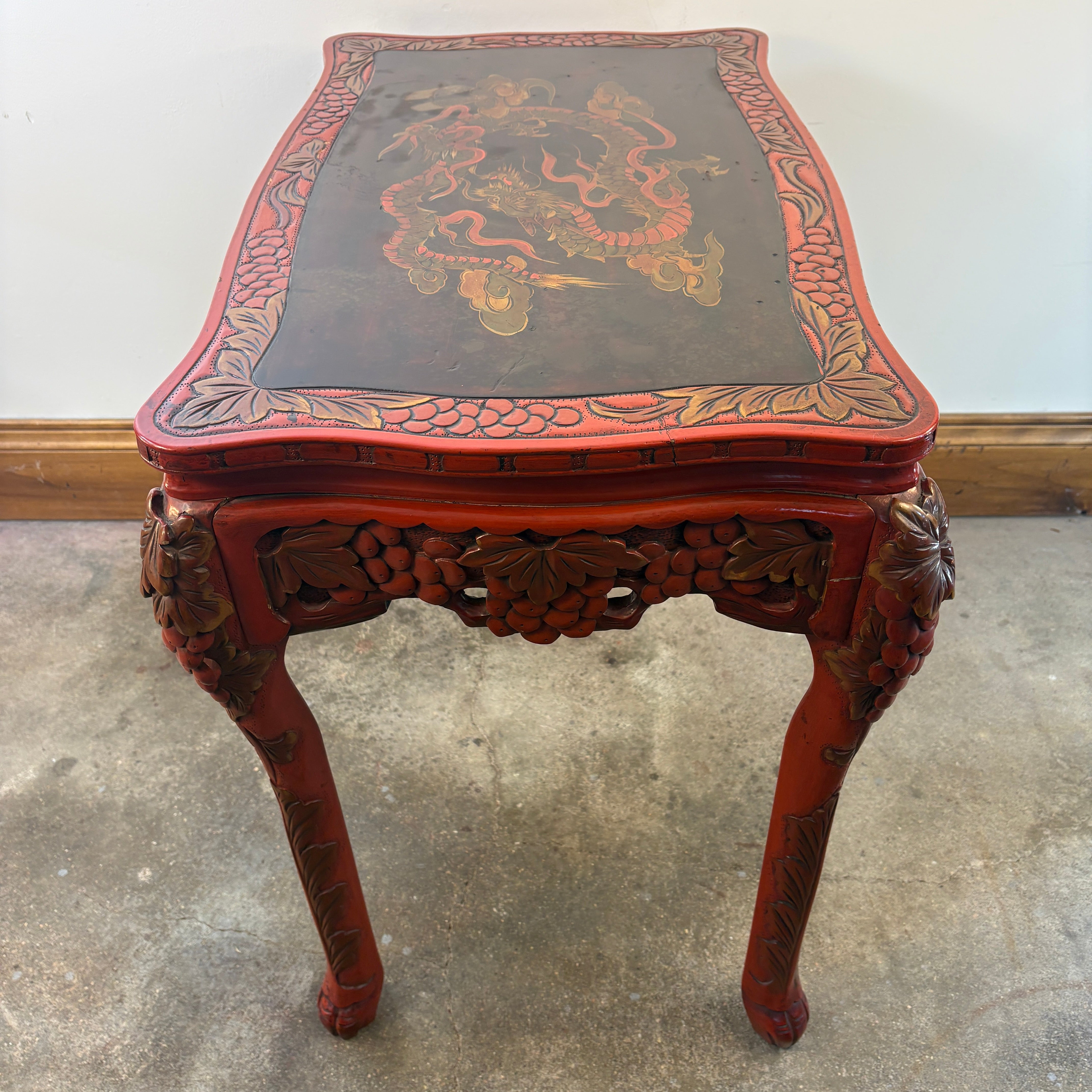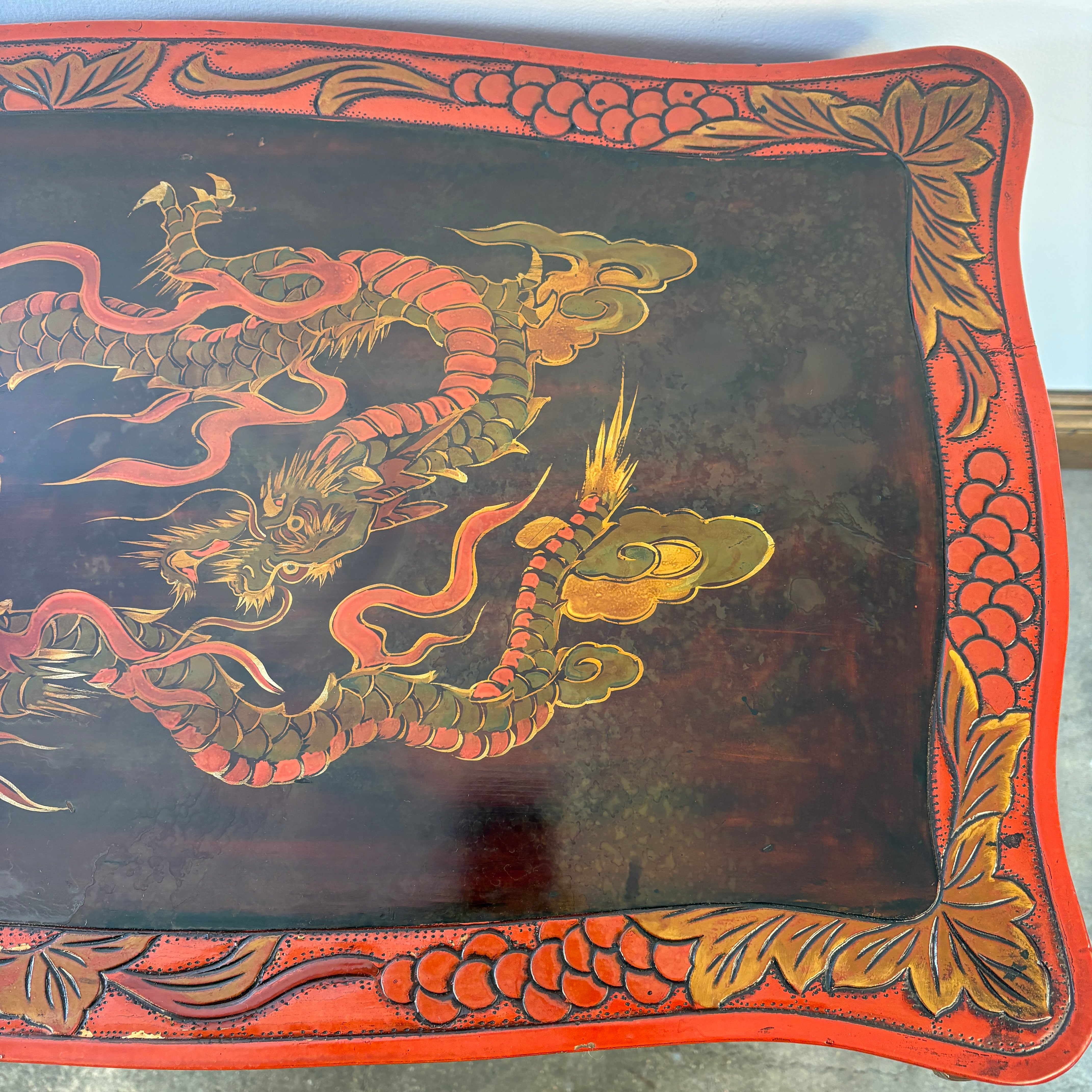Vintage Japanese Carved Wood and Lacquer Finish Table or Desk, Hand Painted Dragon Motif, Meiji Period