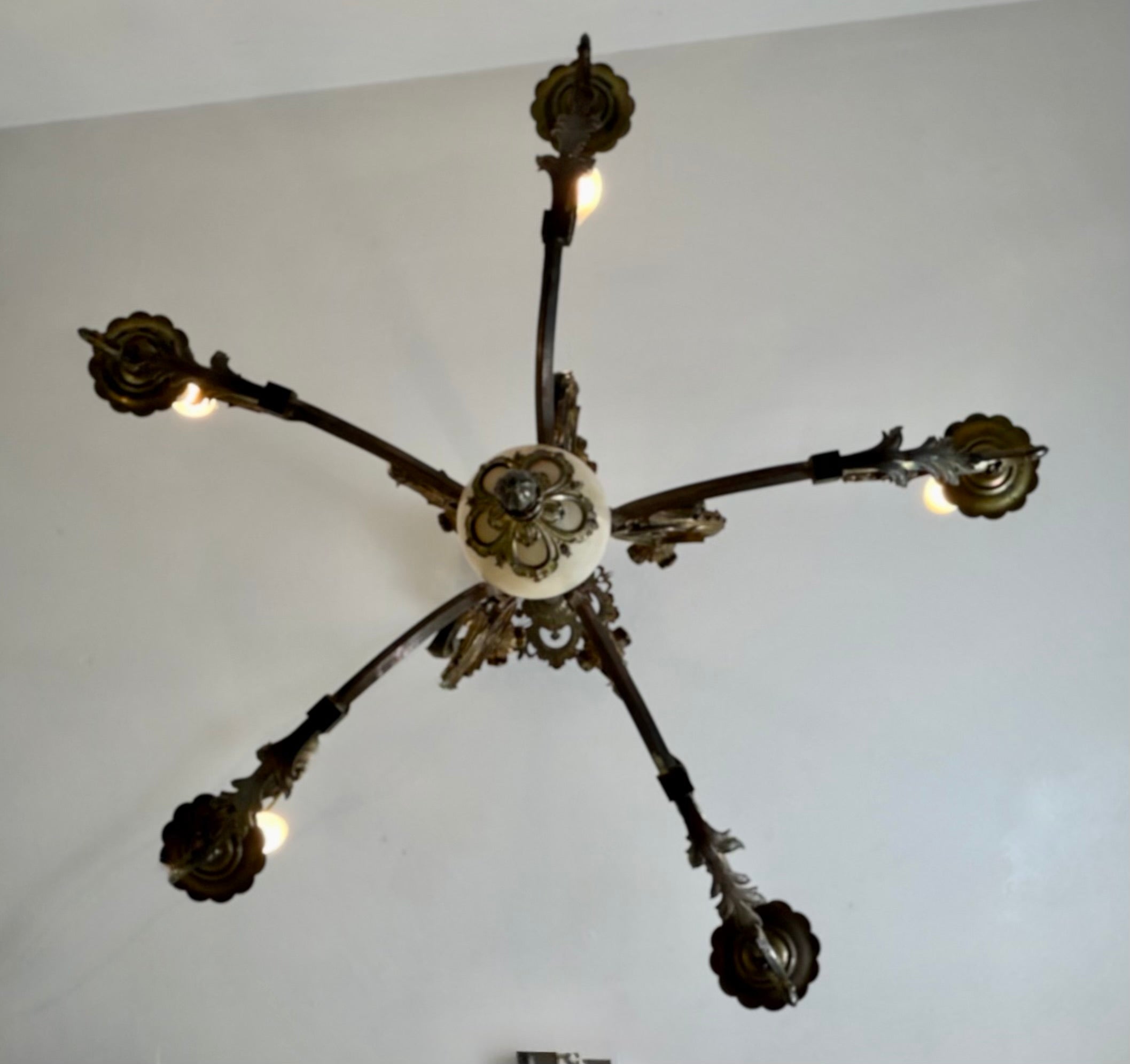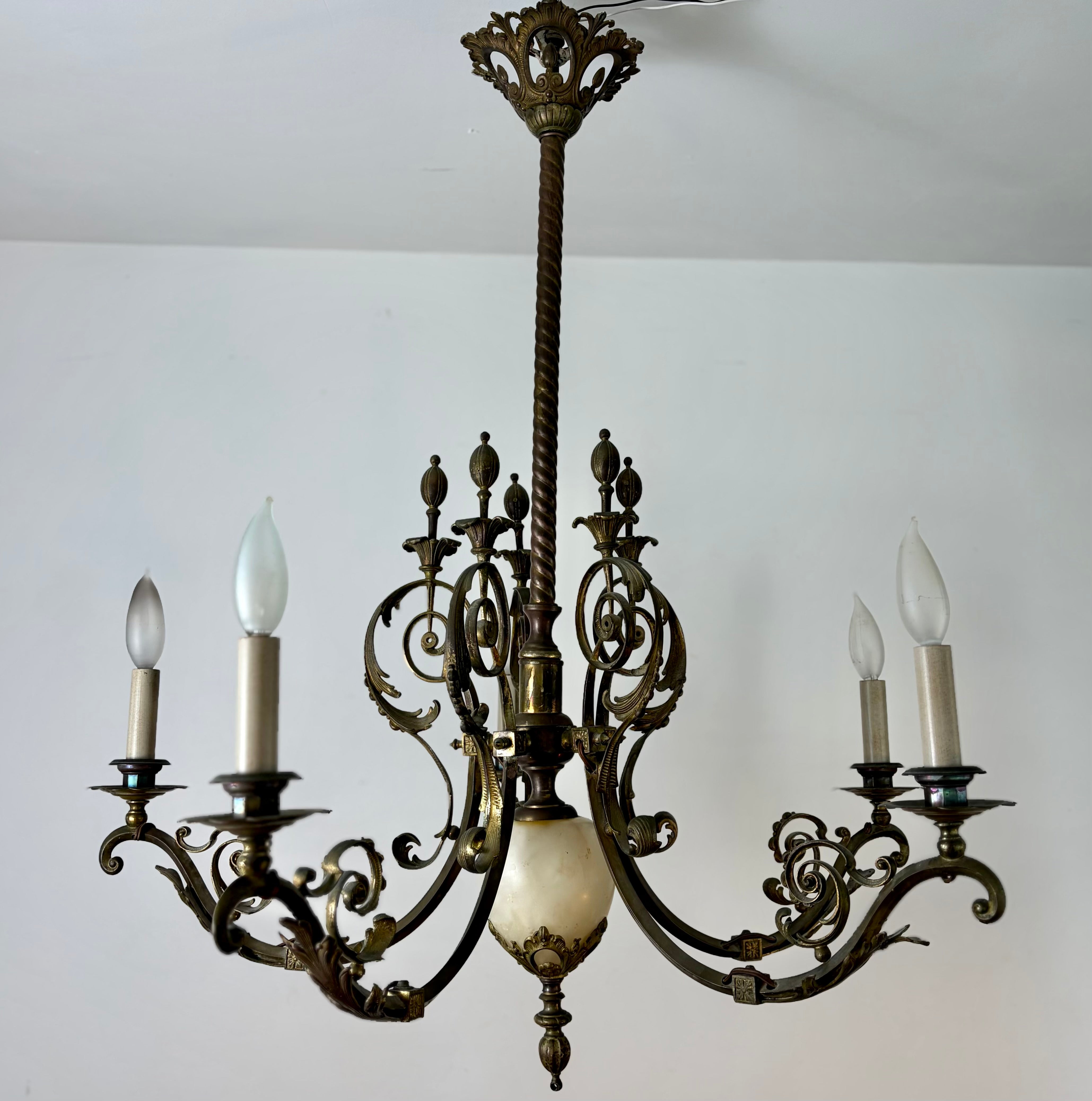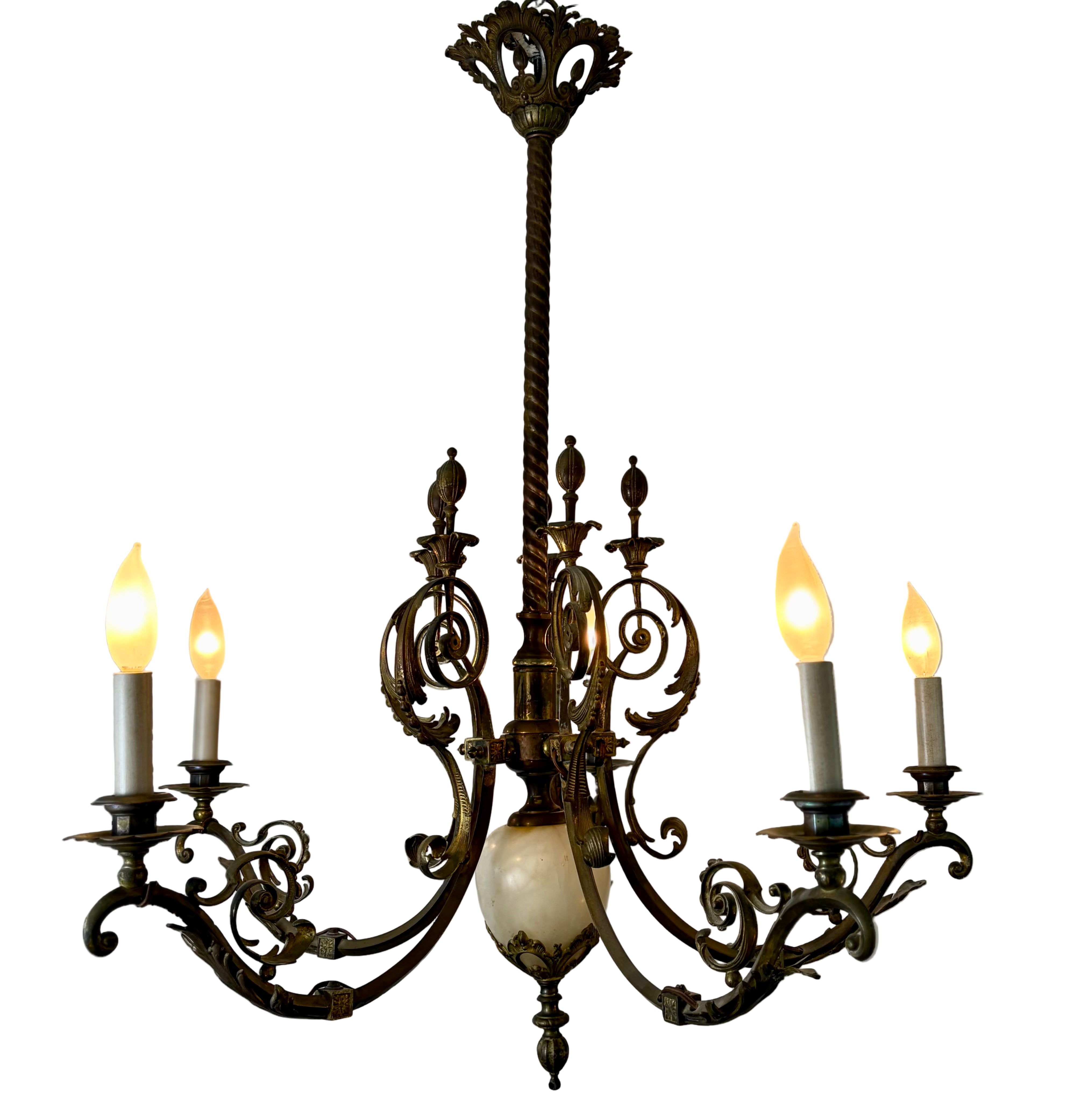 Vintage Chandelier, 5- Arm, Ornate, Golden Metal with Cream Stone Center.