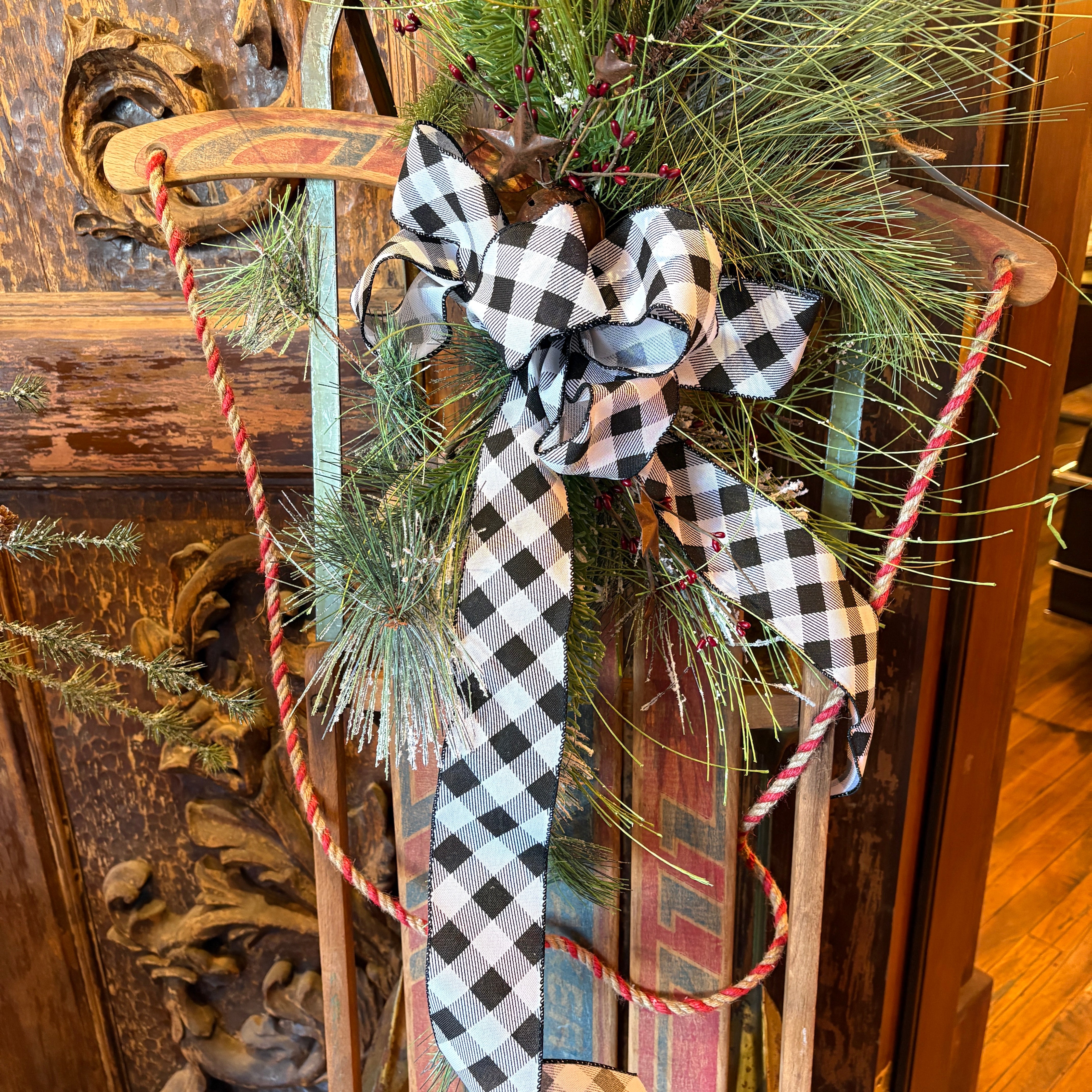 Vintage Sled Adorned and Reimagined with Holiday Charm, Black and White Ribbon