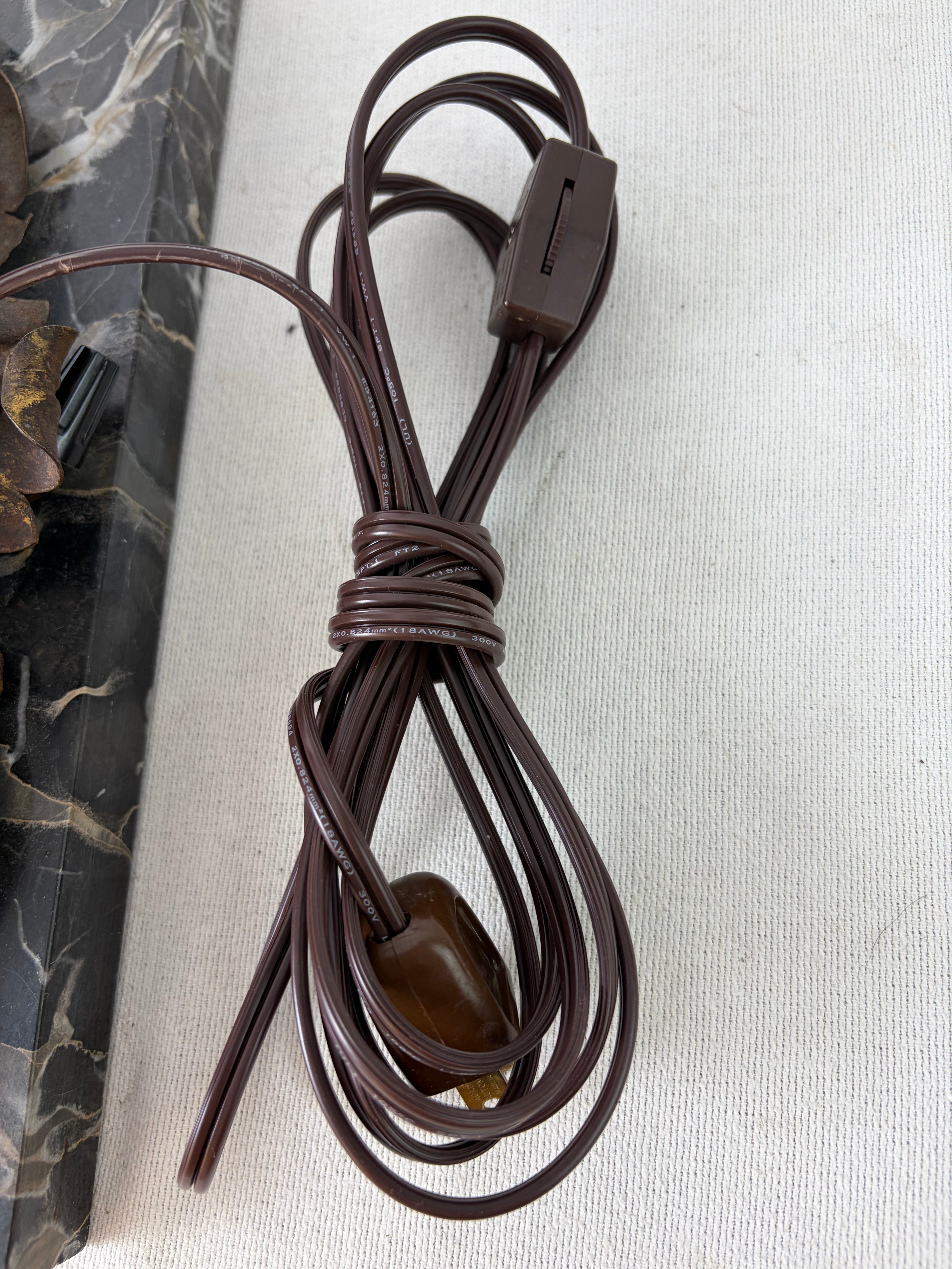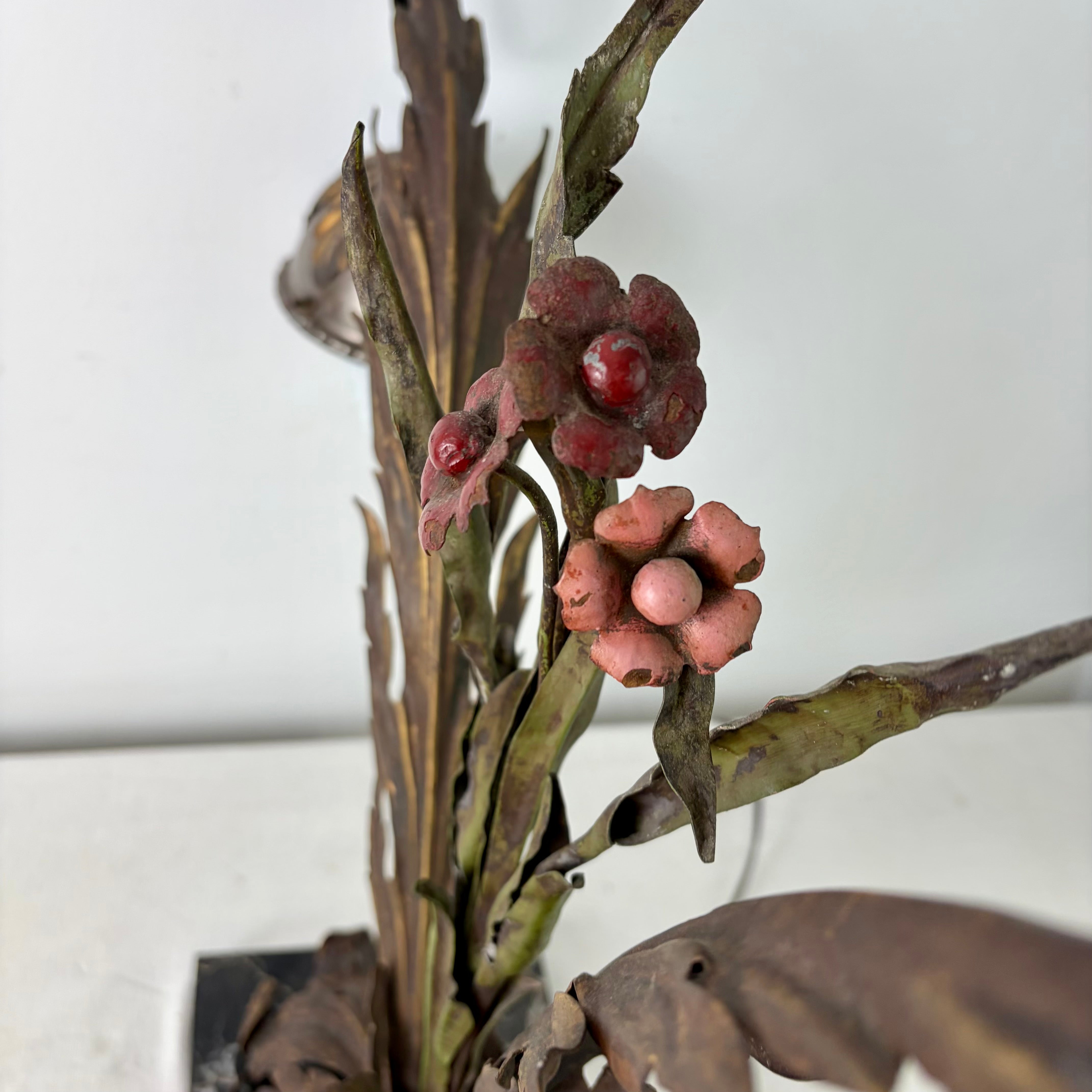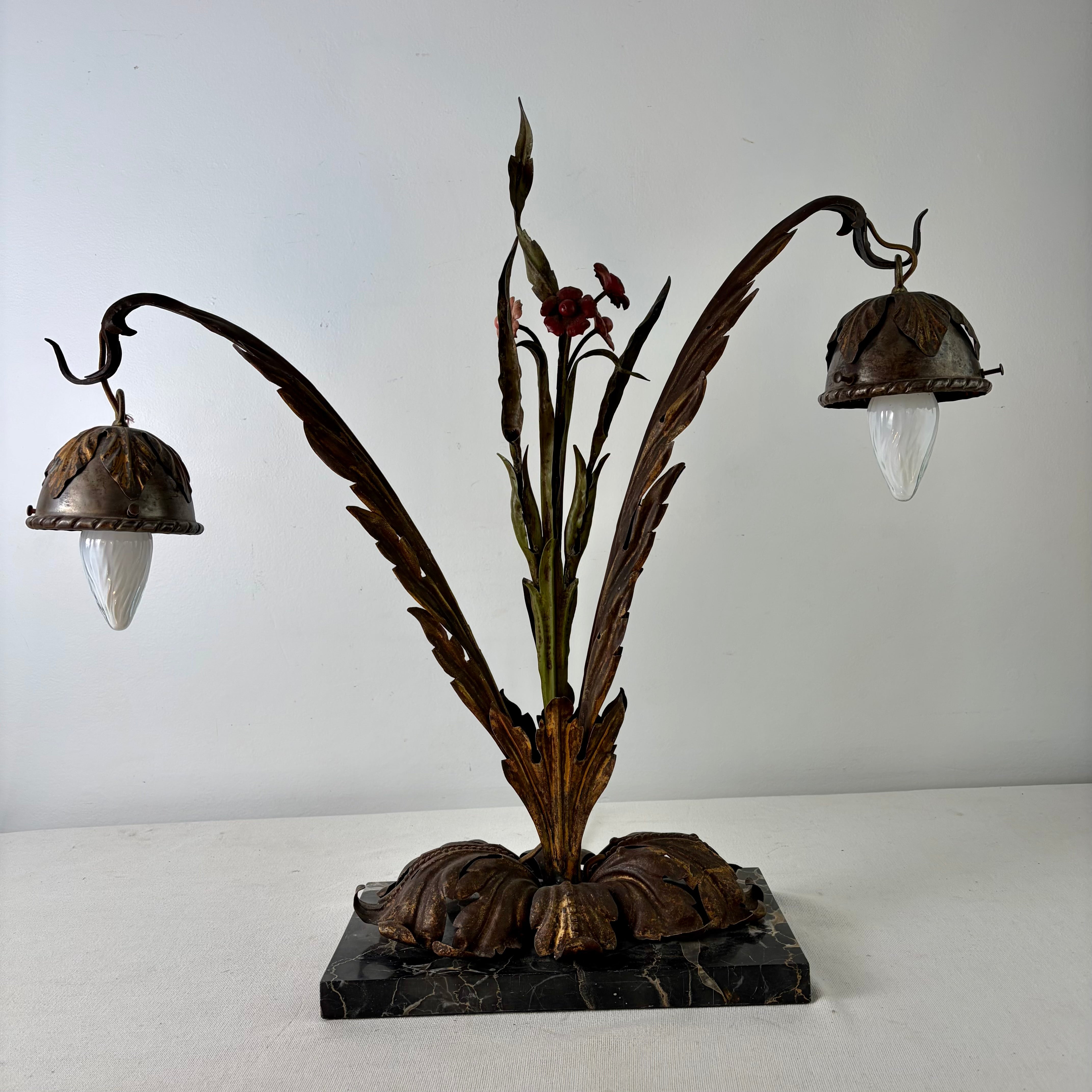 Vintage Table Lamp, Two Arm, Floral Accents in green, maroon and pink. Missing original shades. Uses standard size light bulbs.