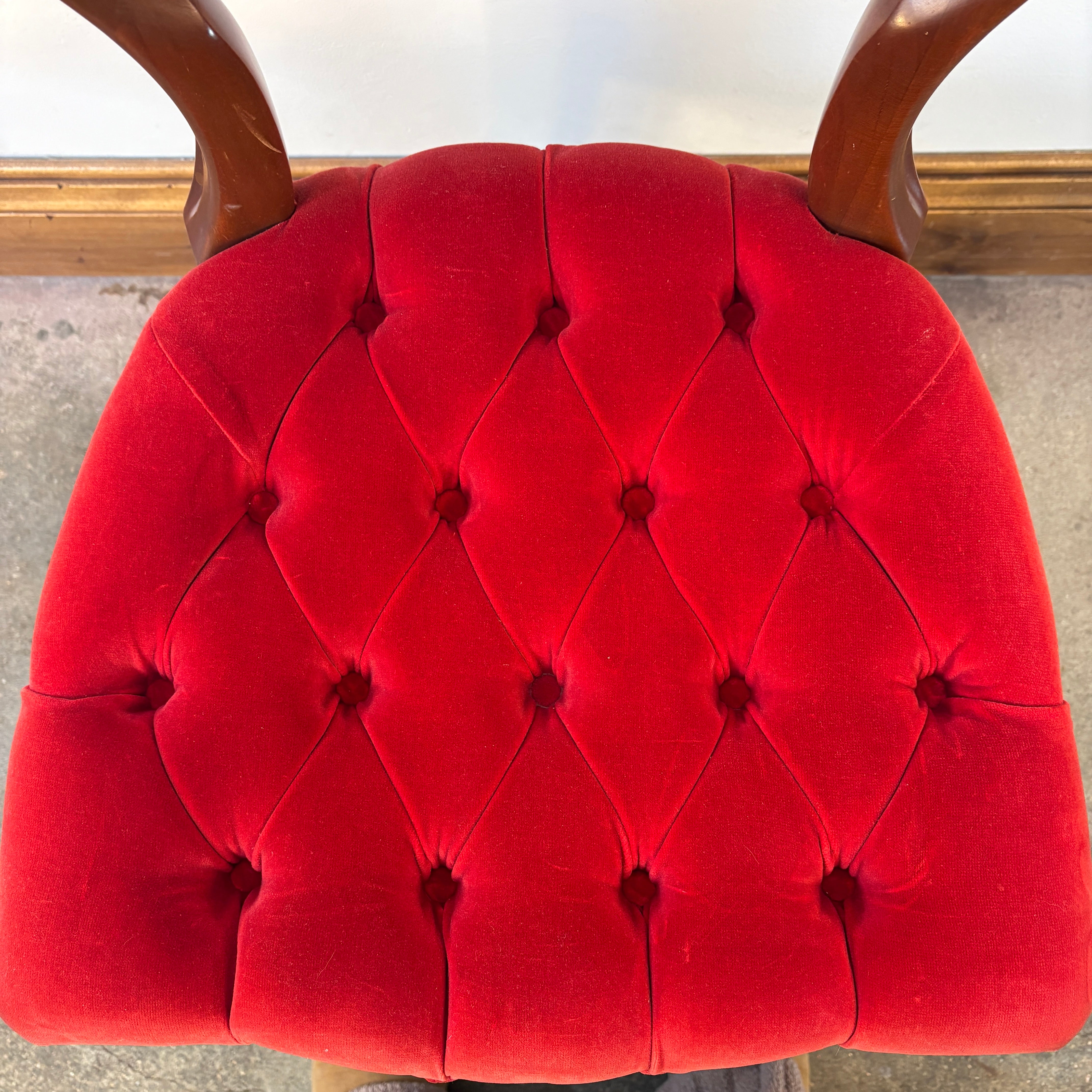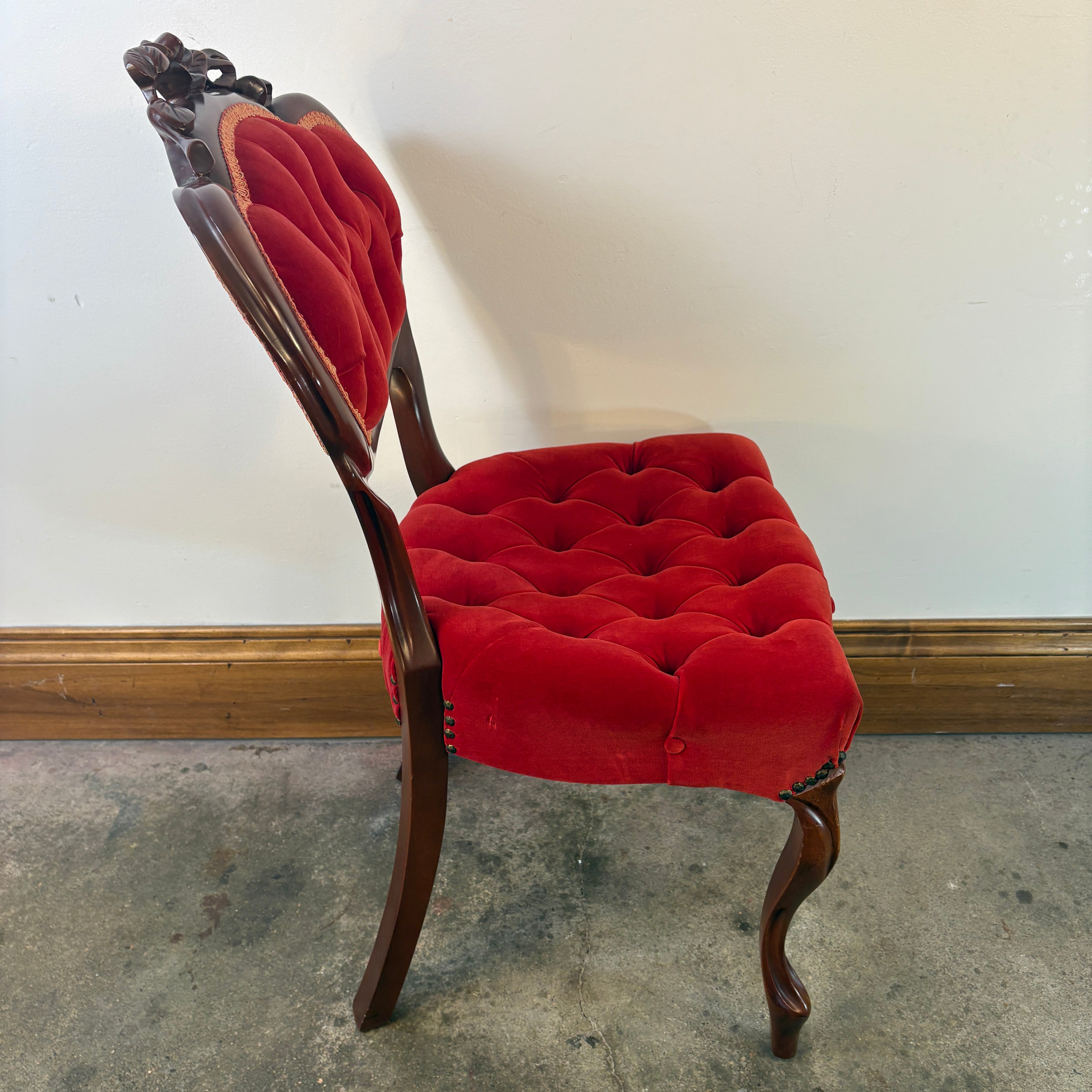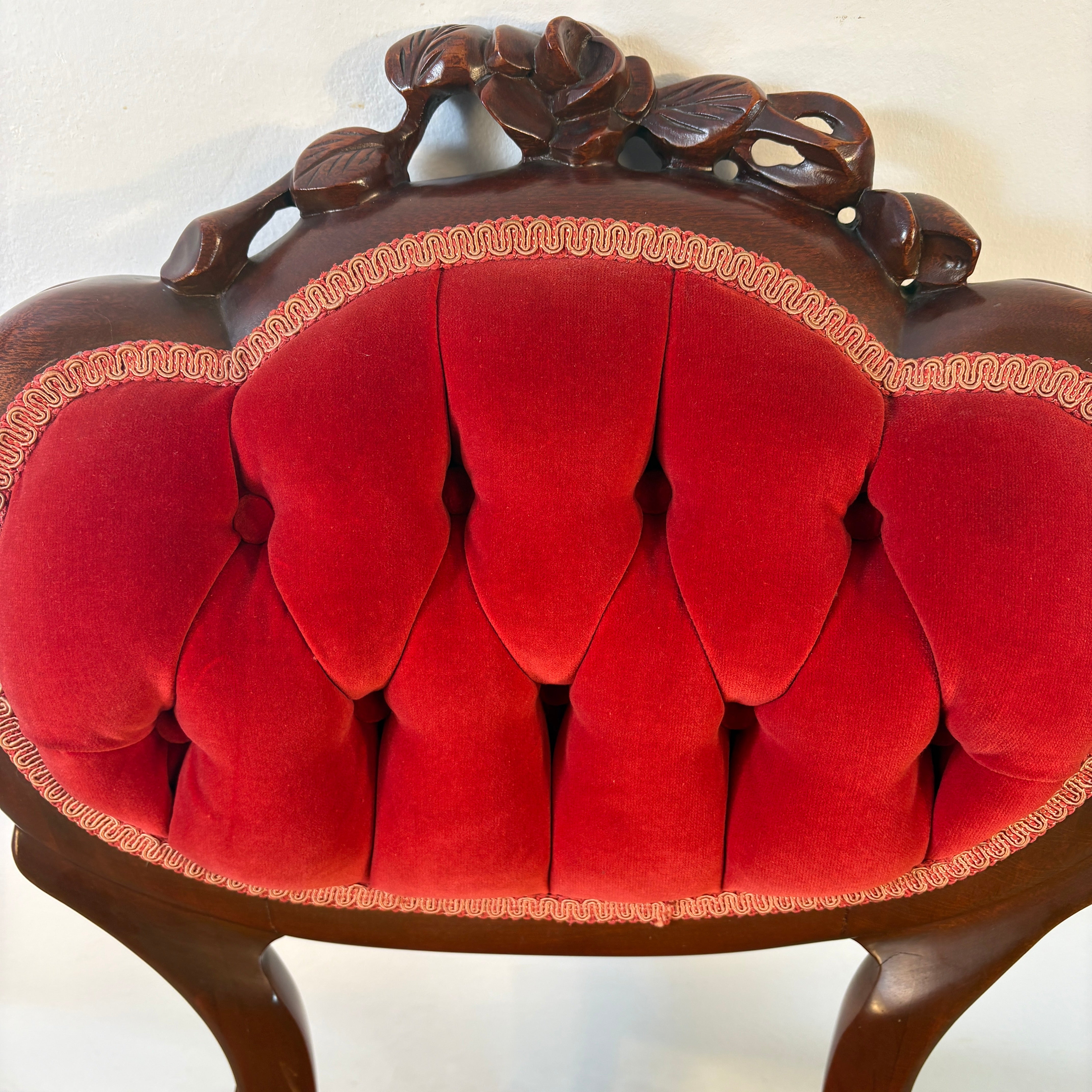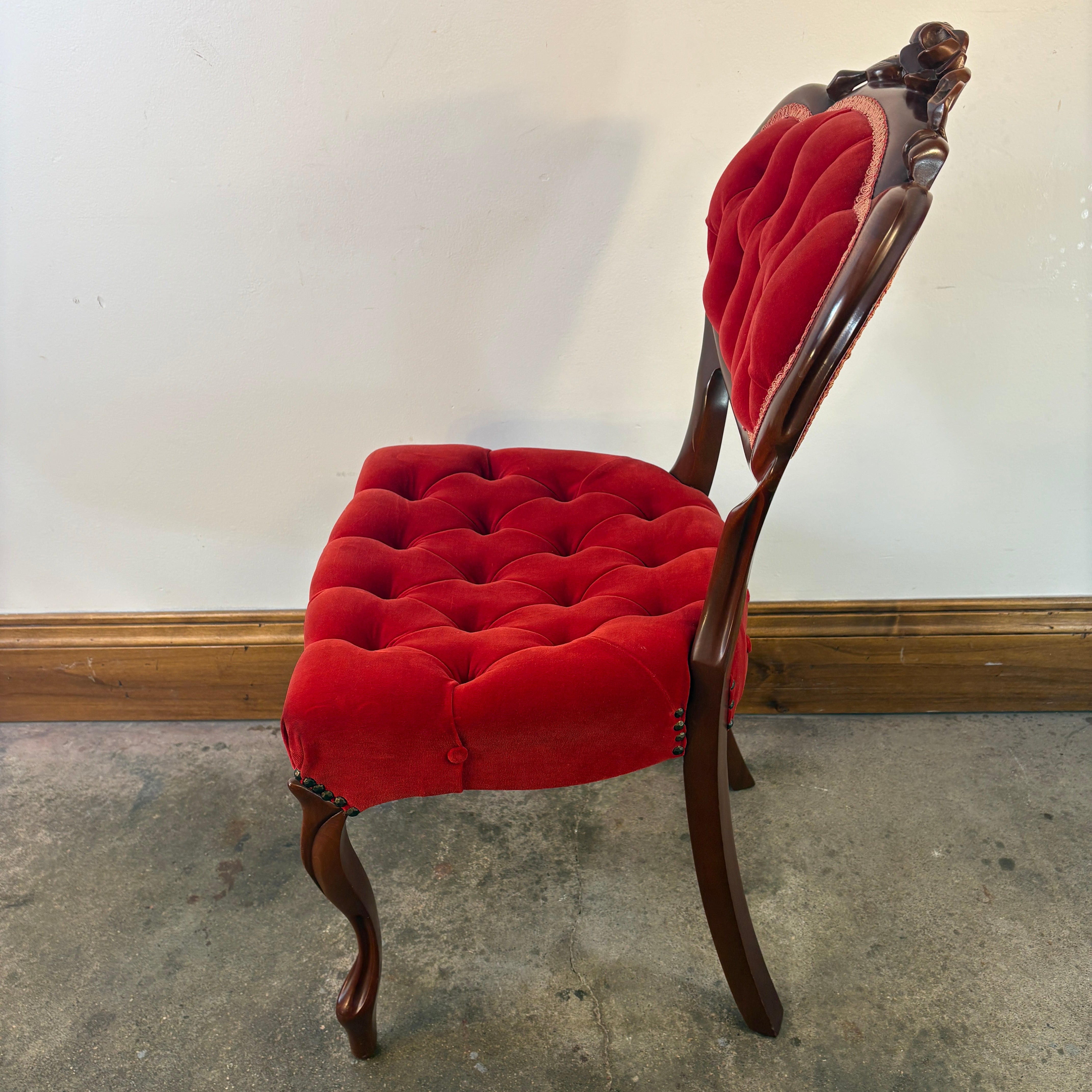 Victorian Wood and Tufted Red Velvet Parlor Chair with Carved Roses