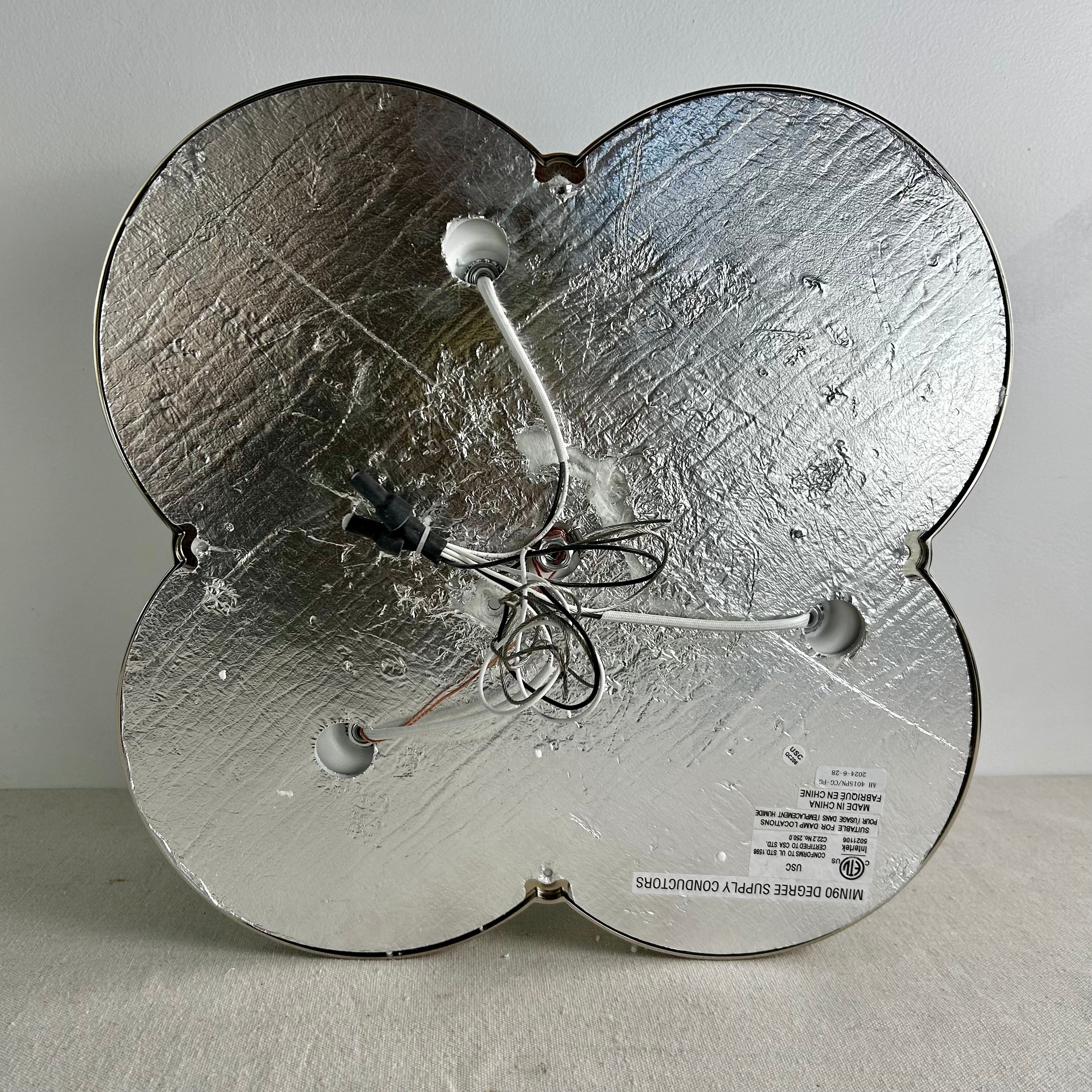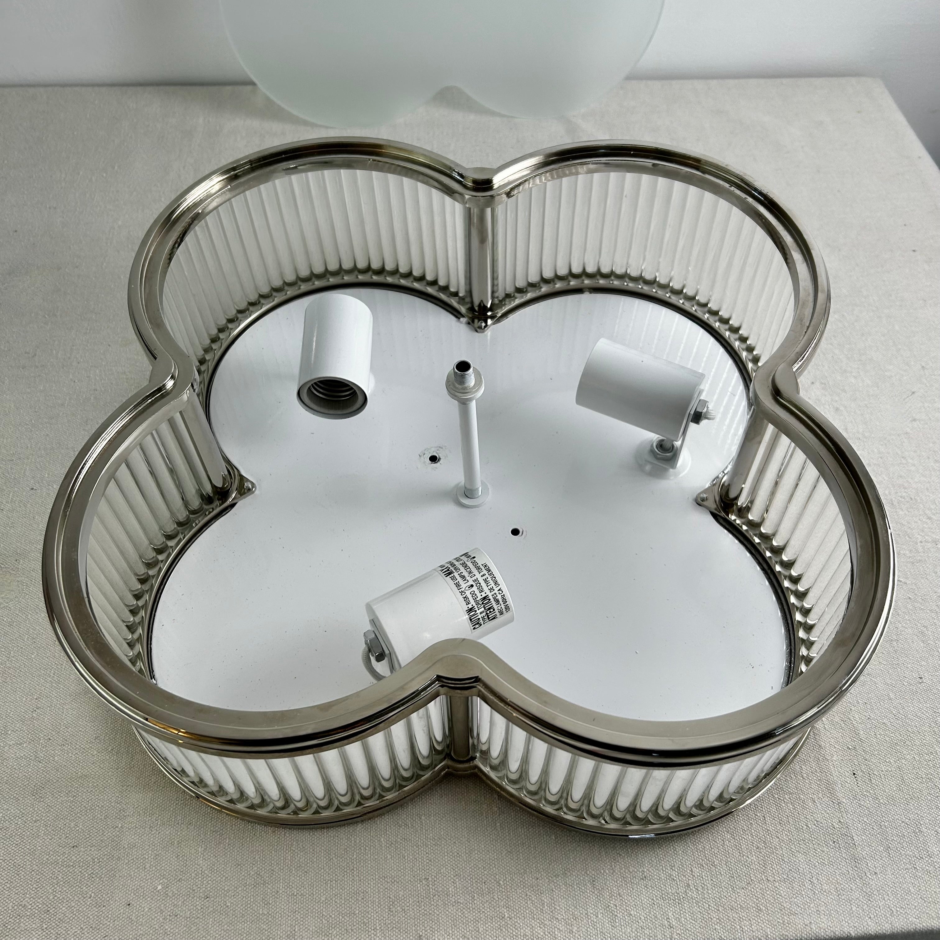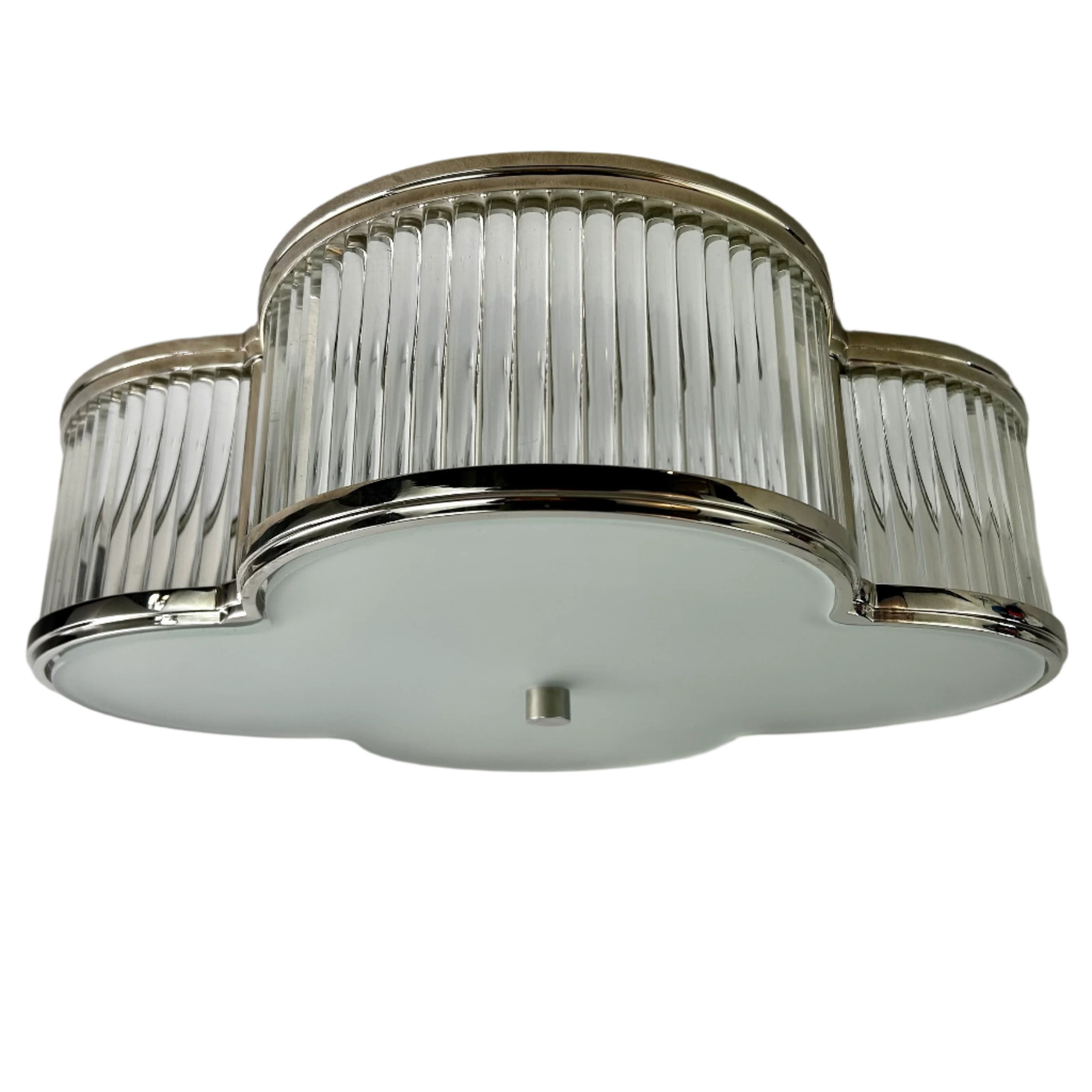 Visual Comfort Alexa Hampton Collection, flush mount ceiling light. Four leaf clover look with small glass cylinders circling the edge along with polished nickel trim. It has three interior light sockets.