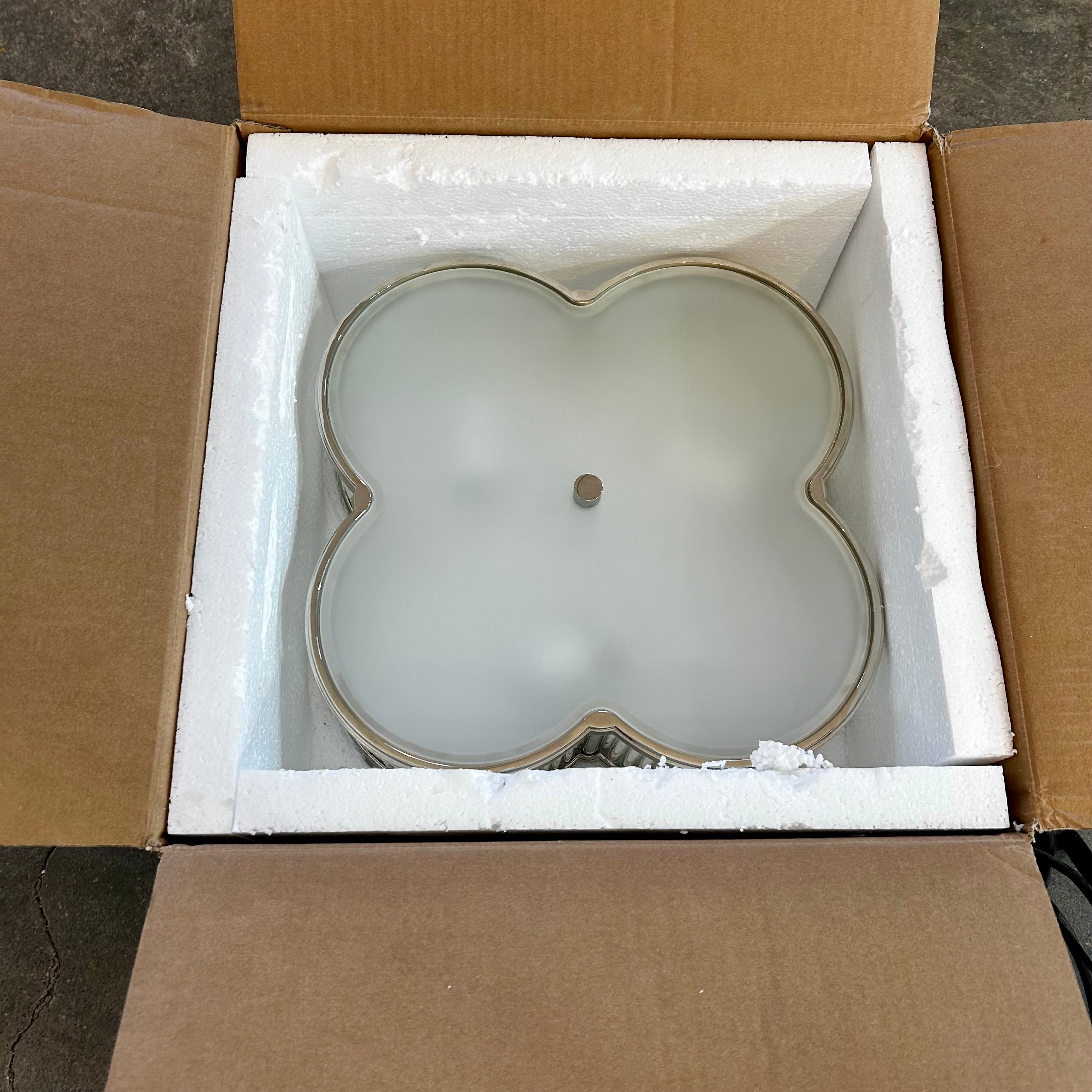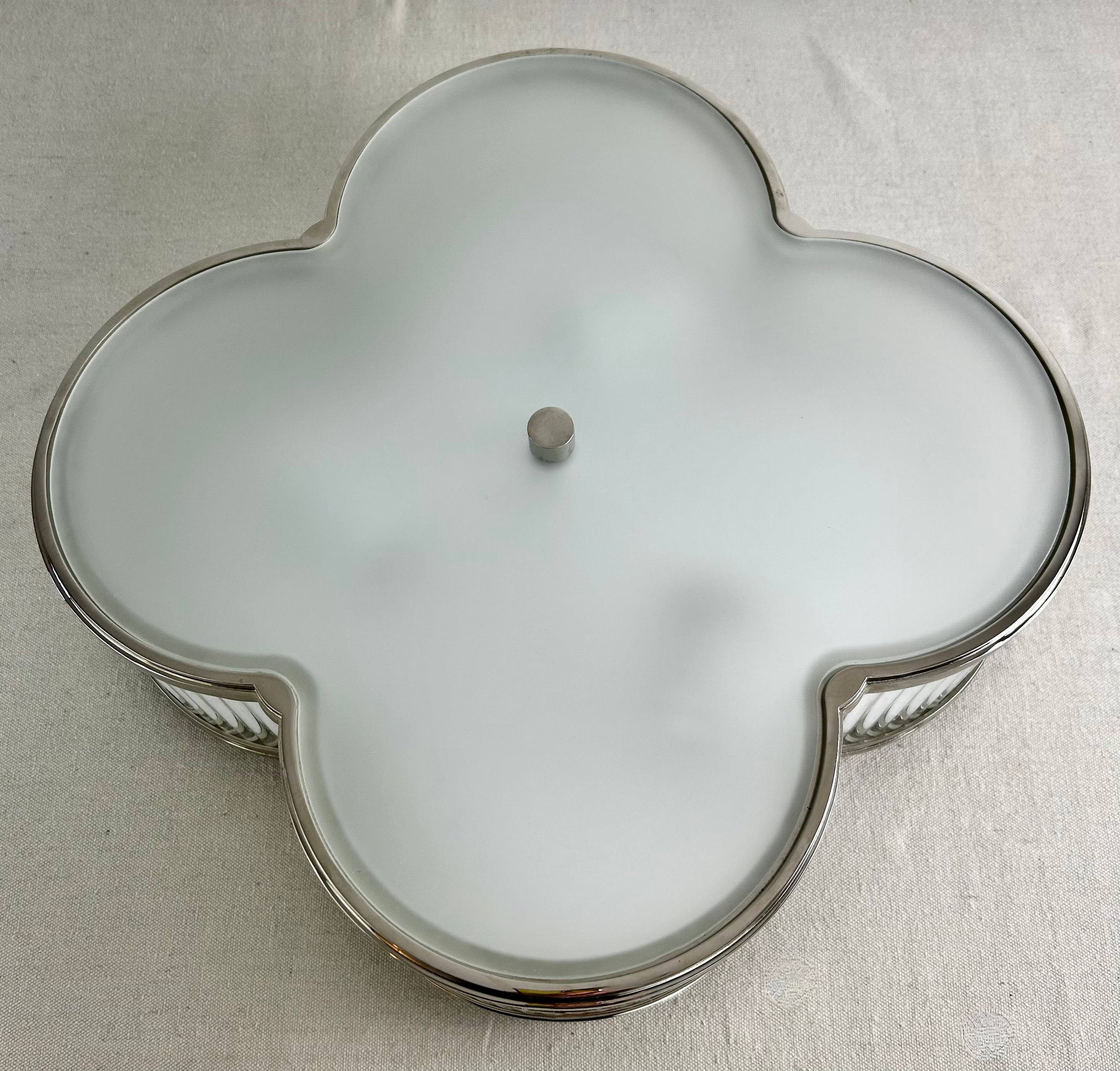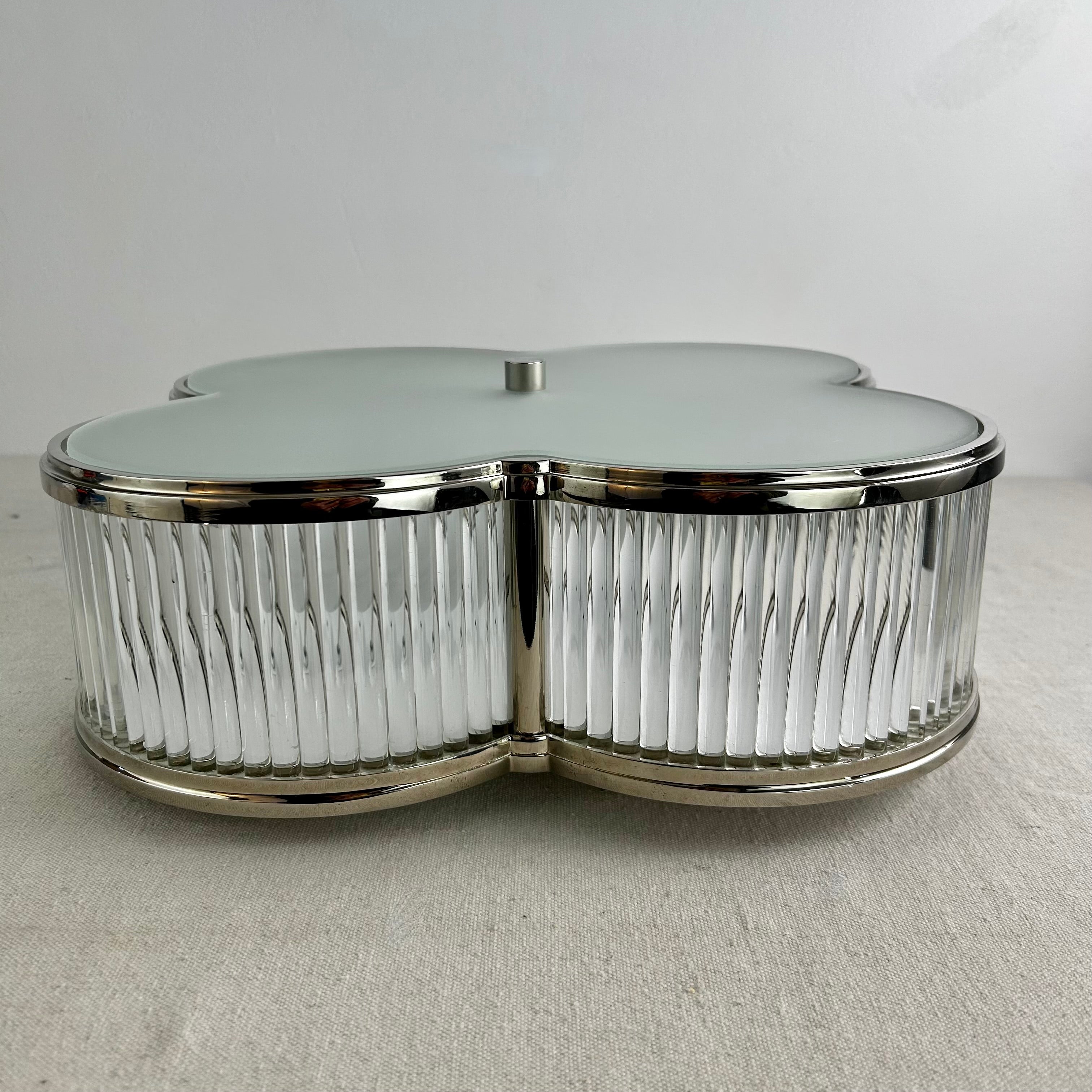 Visual Comfort Alexa Hampton Collection, flush mount ceiling light. Four leaf clover look with small glass cylinders circling the edge along with polished nickel trim. It has three interior light sockets.