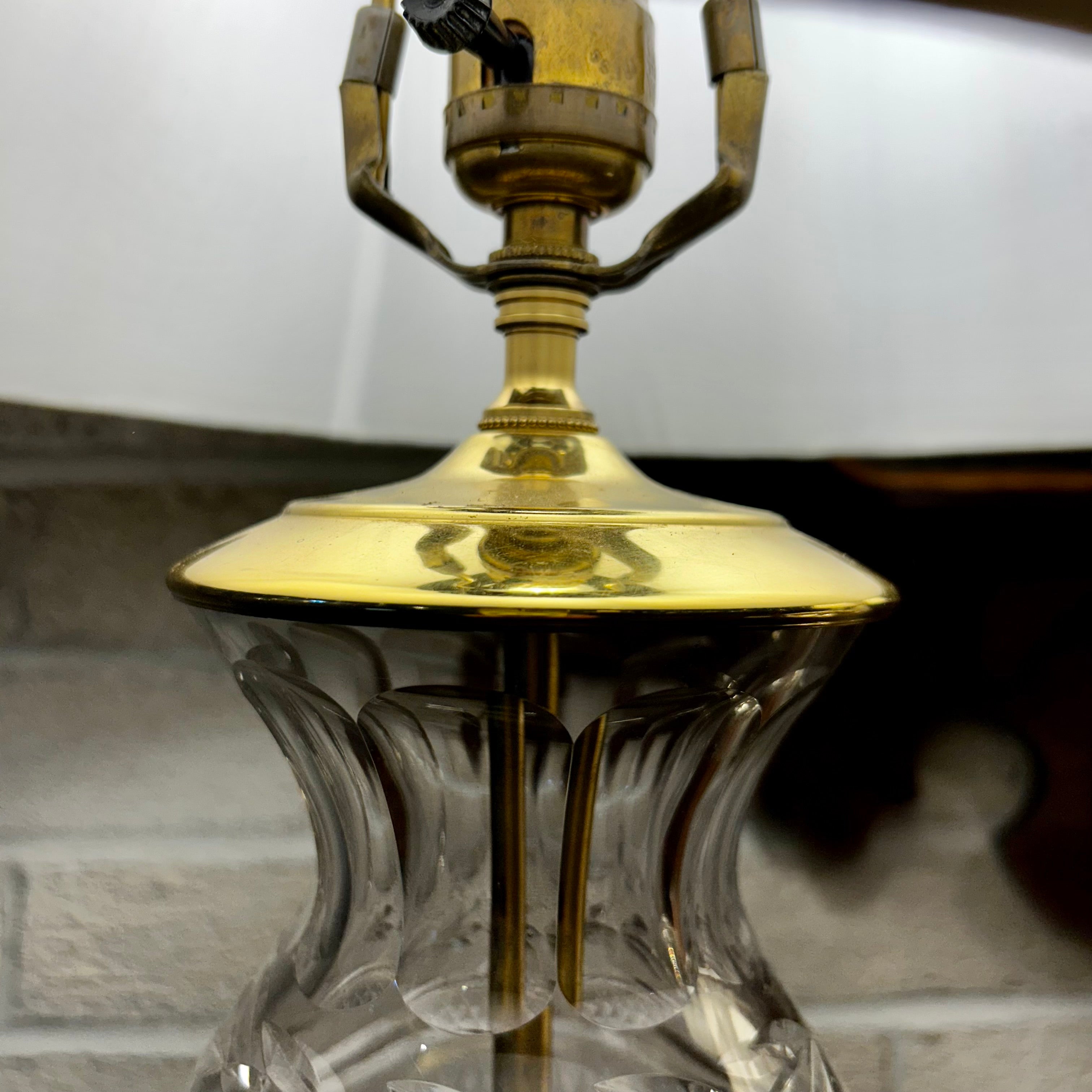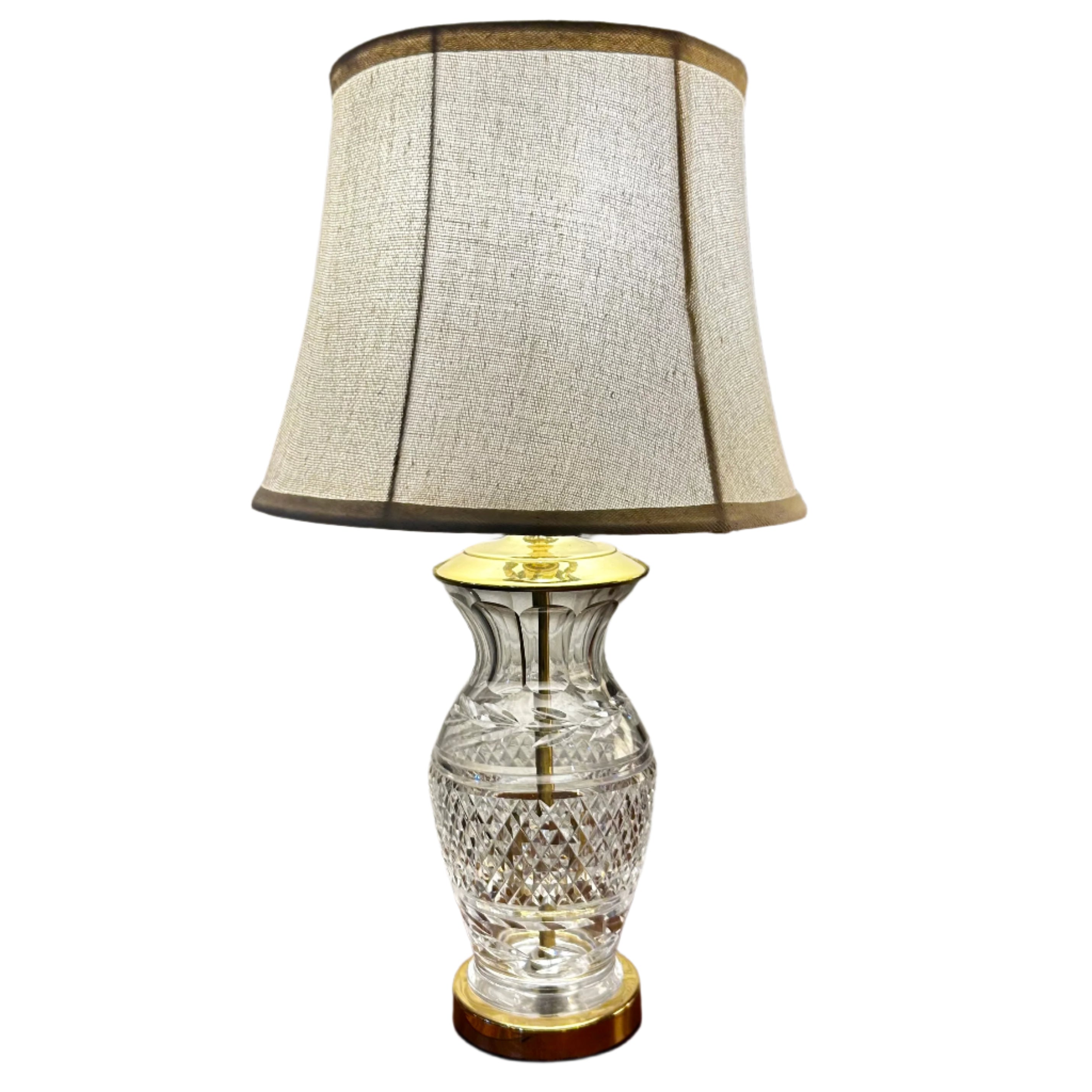 Waterford crystal table lamp, traditional in style, petite in size, includes shade. Has brass hardware. Signature etched above chord grommet.