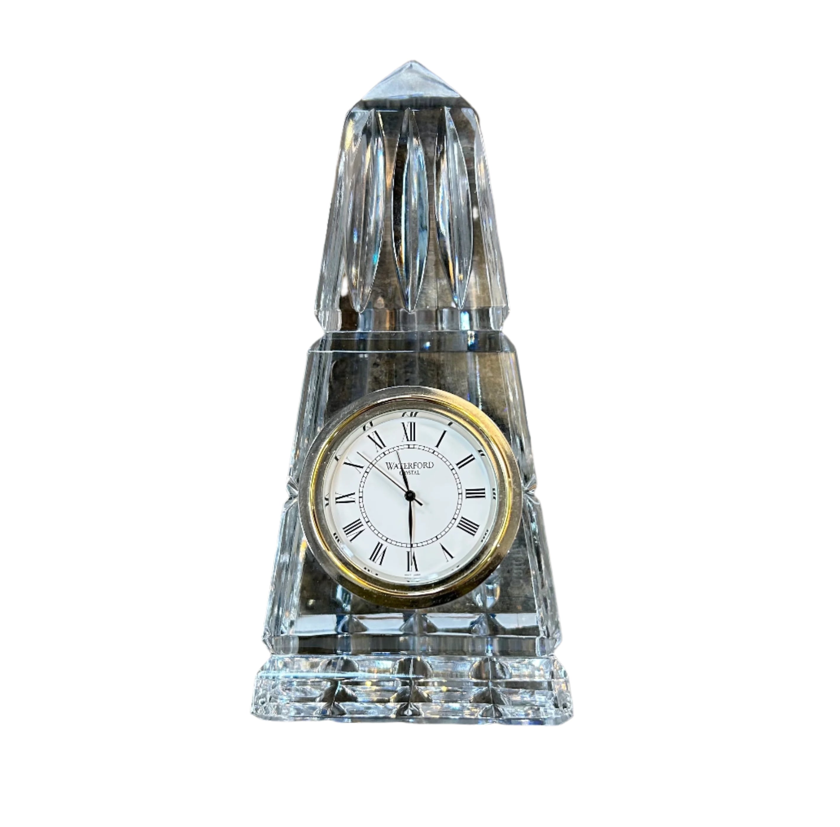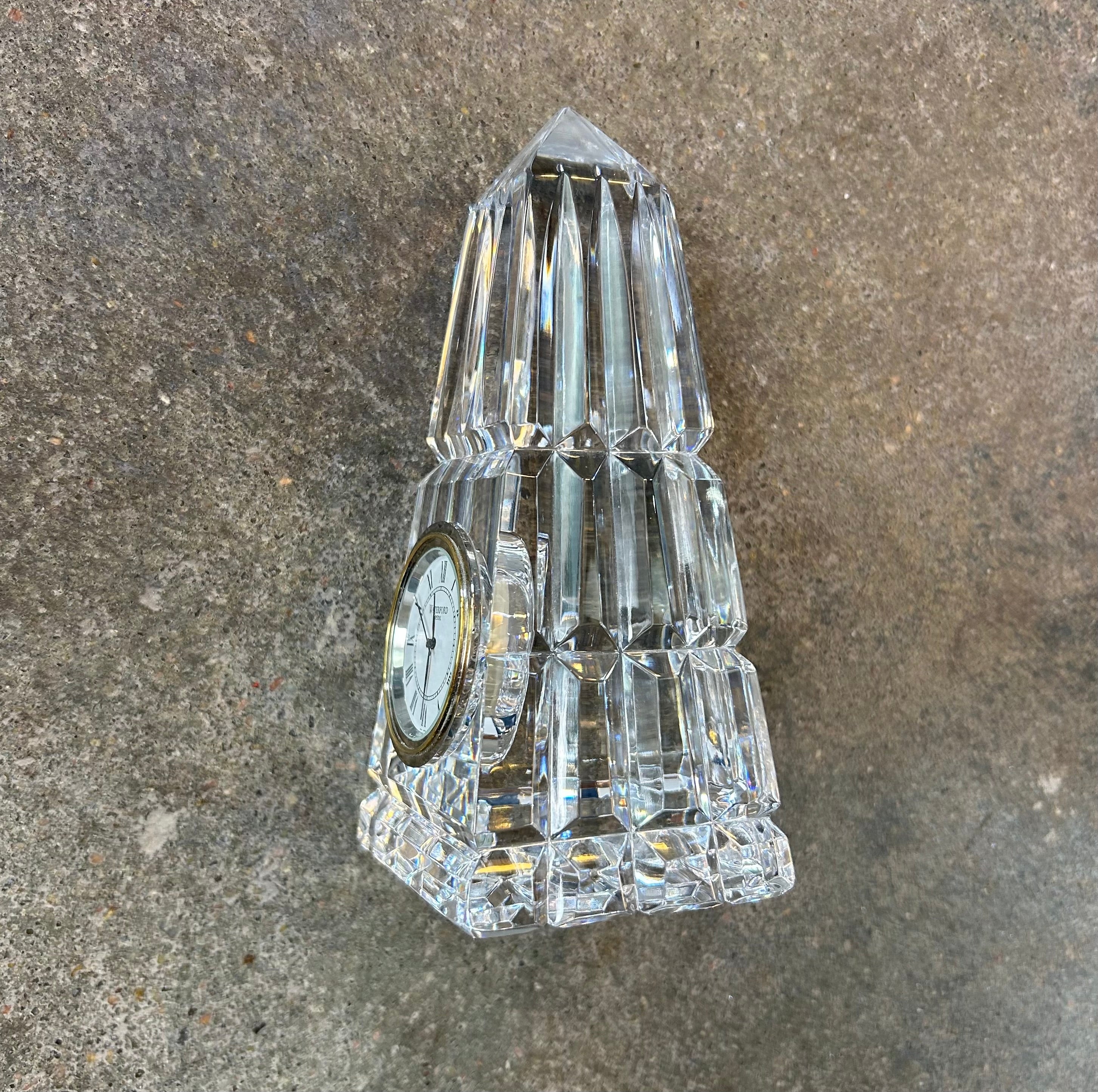 Waterford cut crystal obelisk clock with brass rimed white face, small.