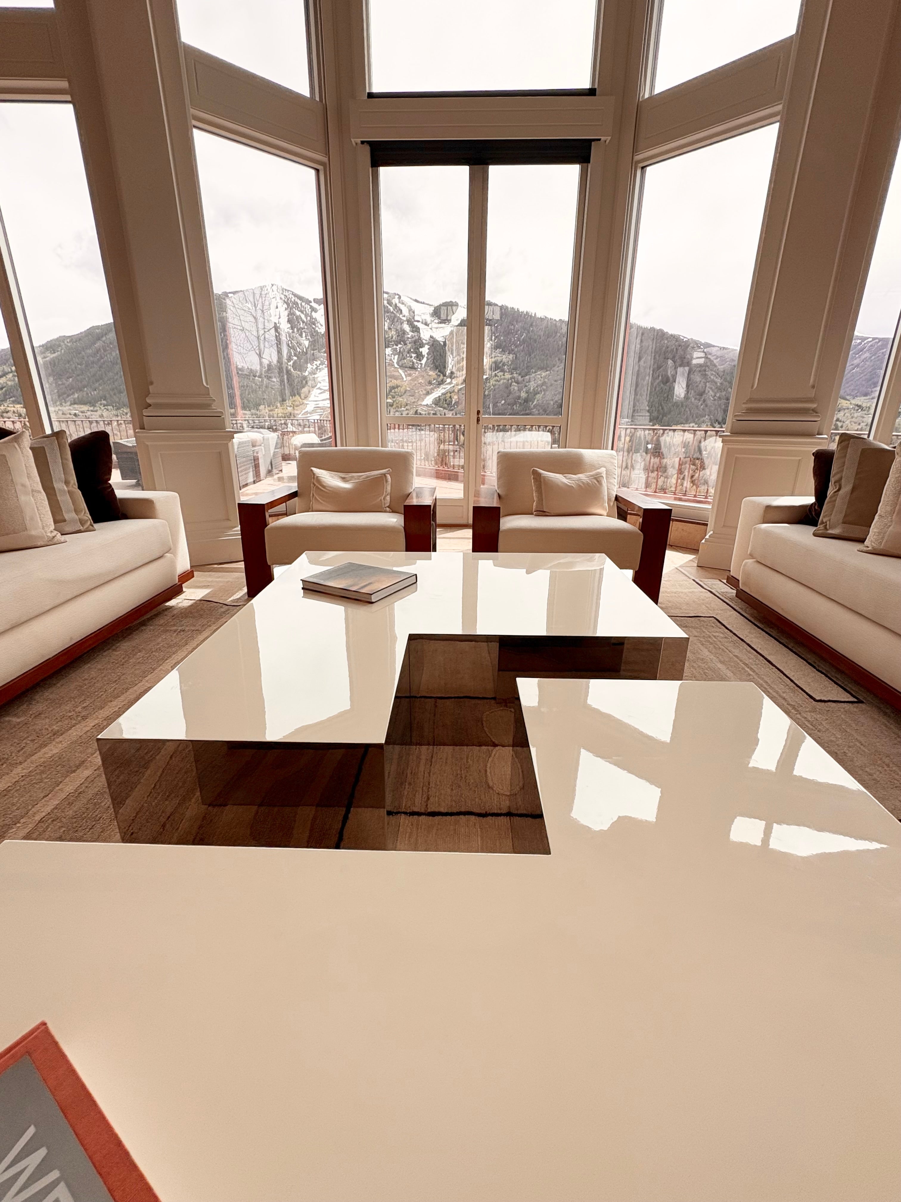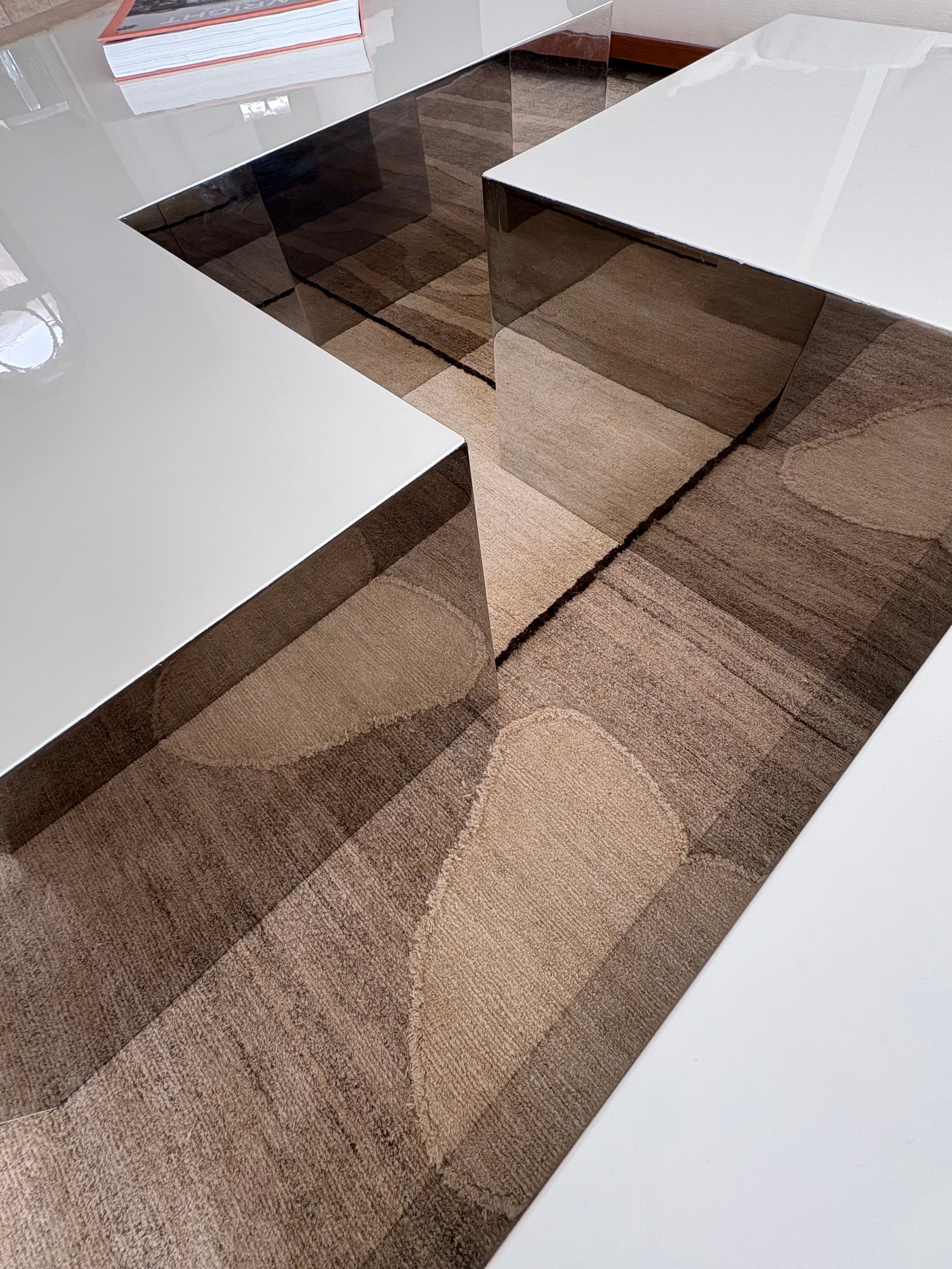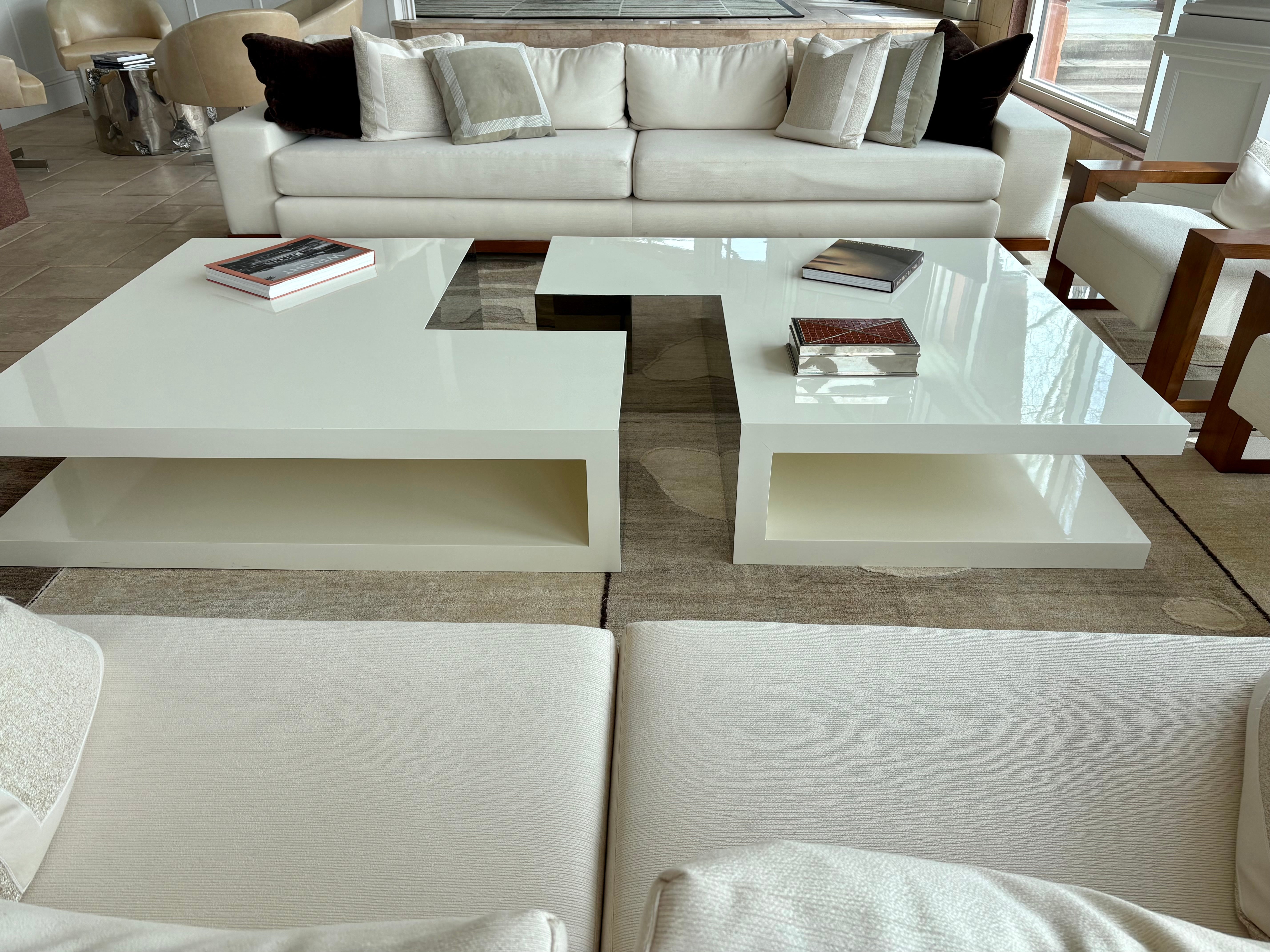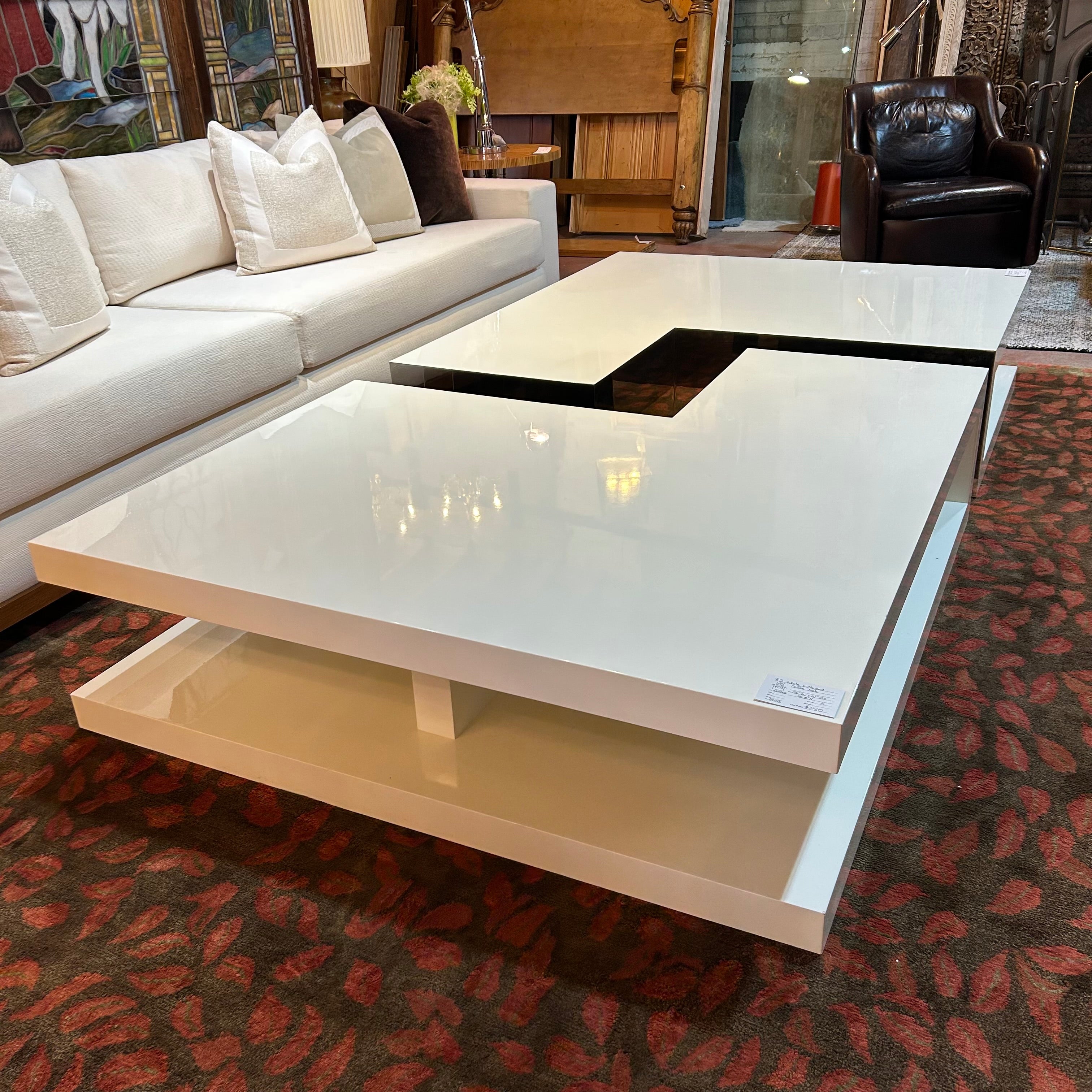 Cream colored L-shaped coffee table, laminate with mirrored sides and shelf below.
