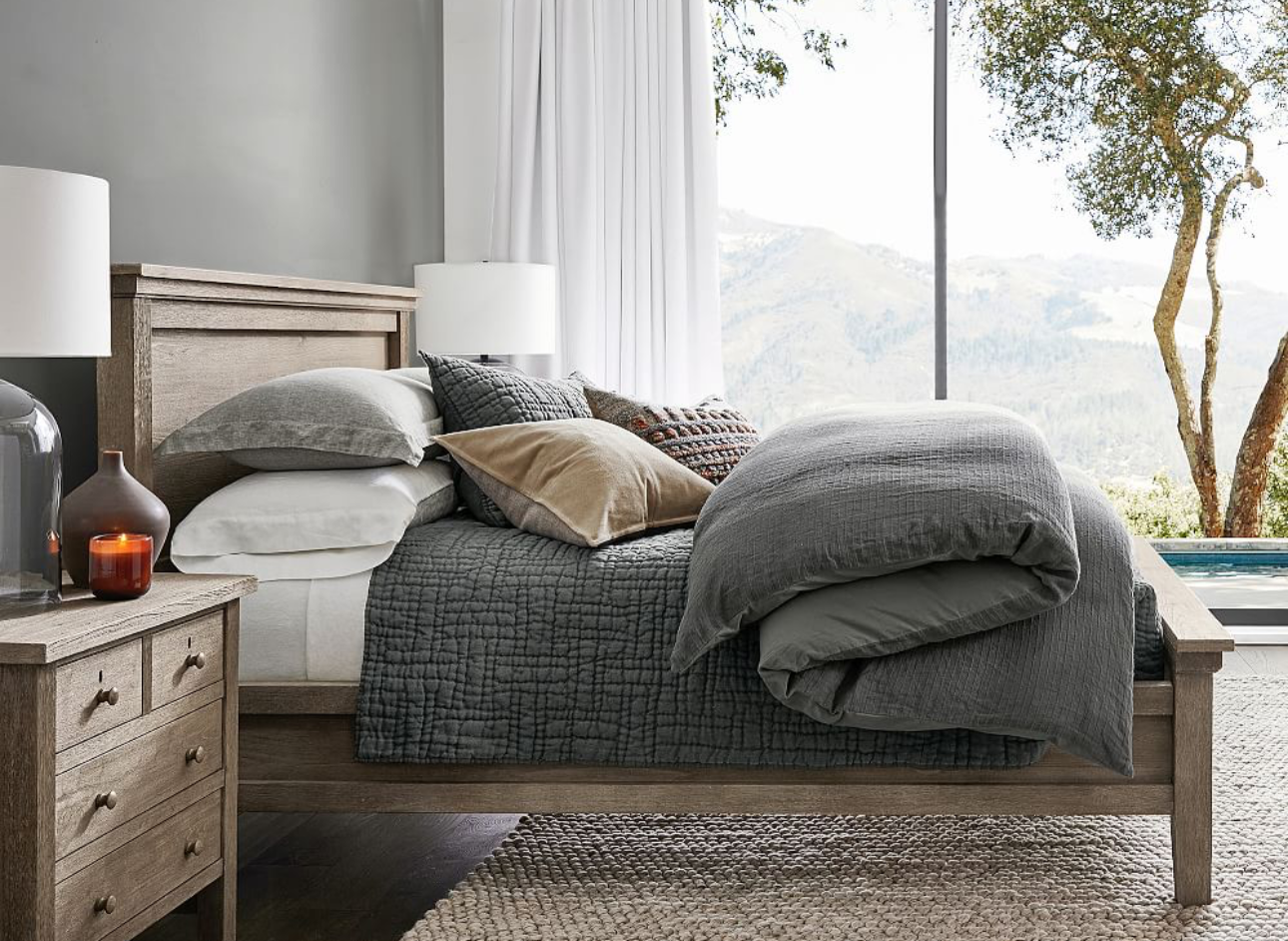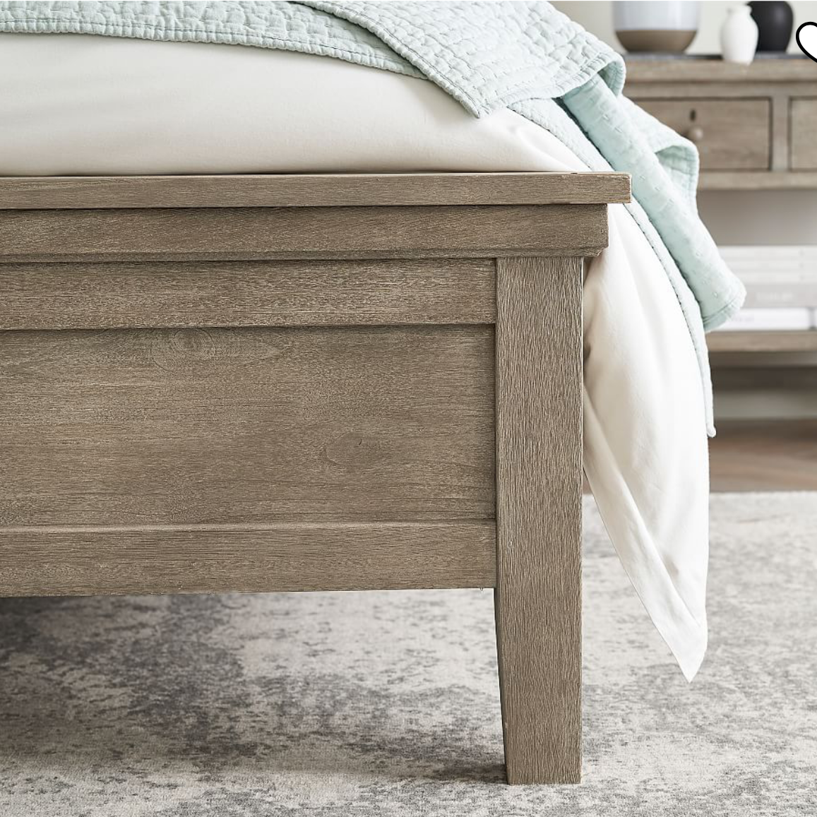 Williams Sonoma Home Full Size Bed Frame in a Grey Wash Finish, Simple Straight Line Design. Mattress and Pillows not Included.