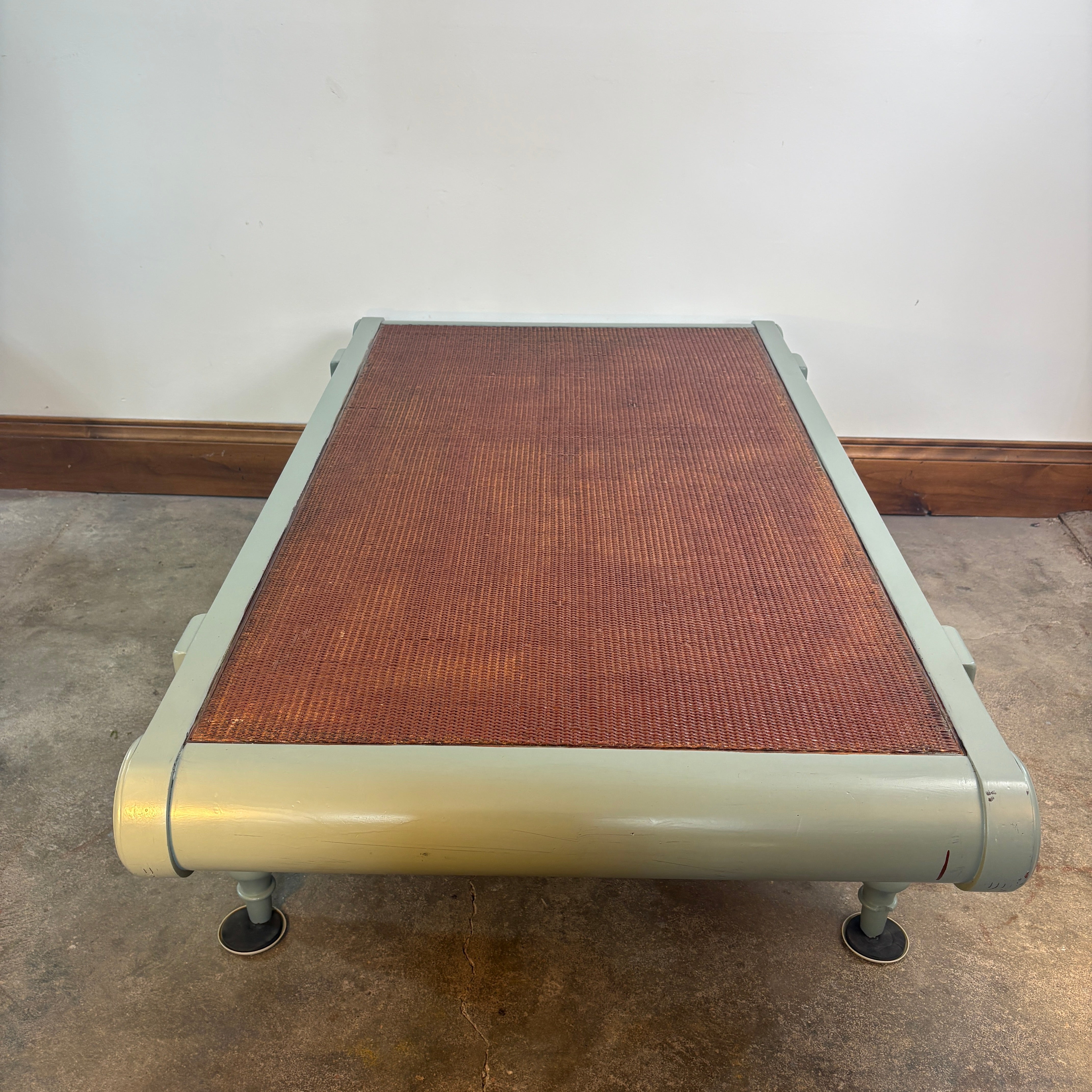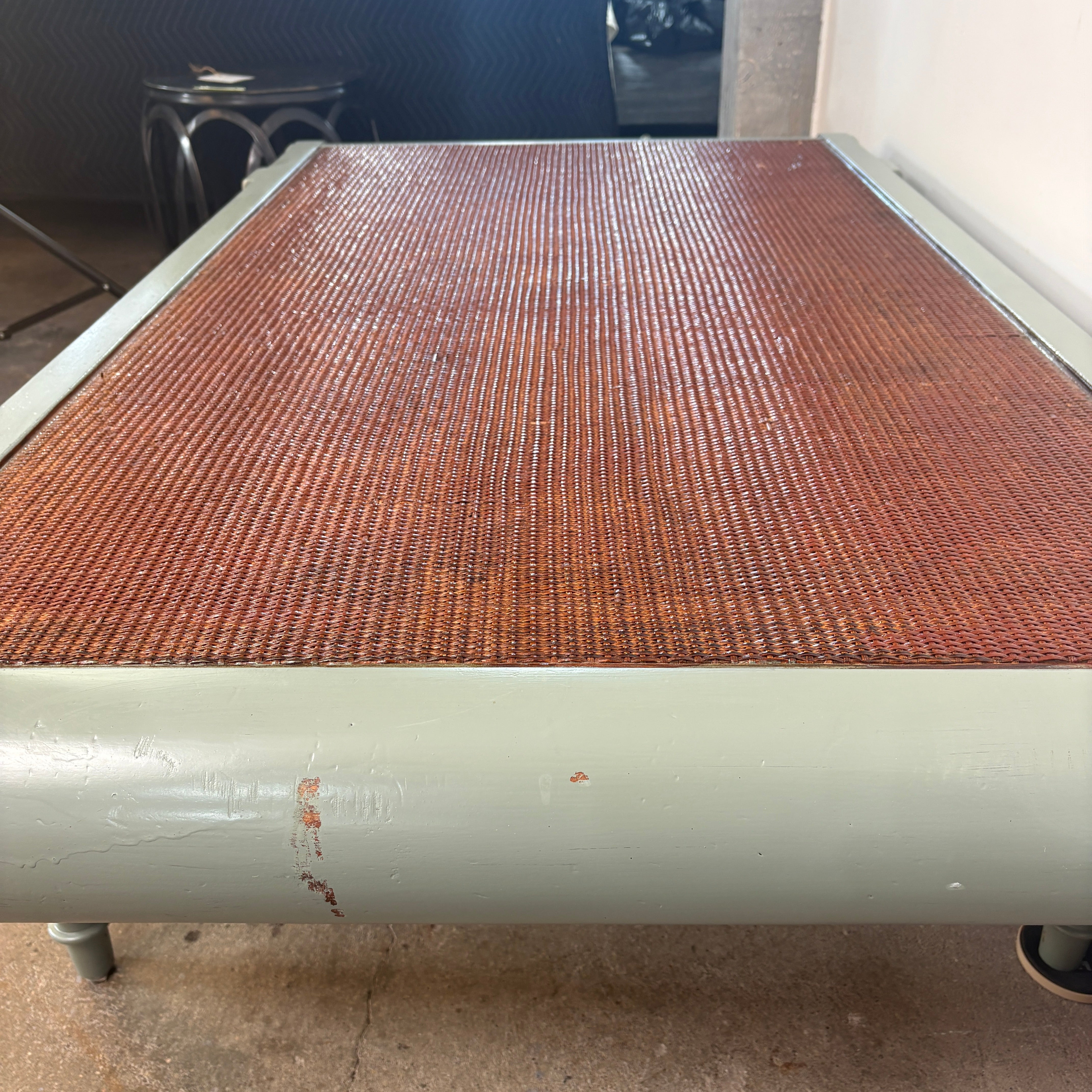 Wicker top and wood frame coffee table in sage green with brass accents, vintage.