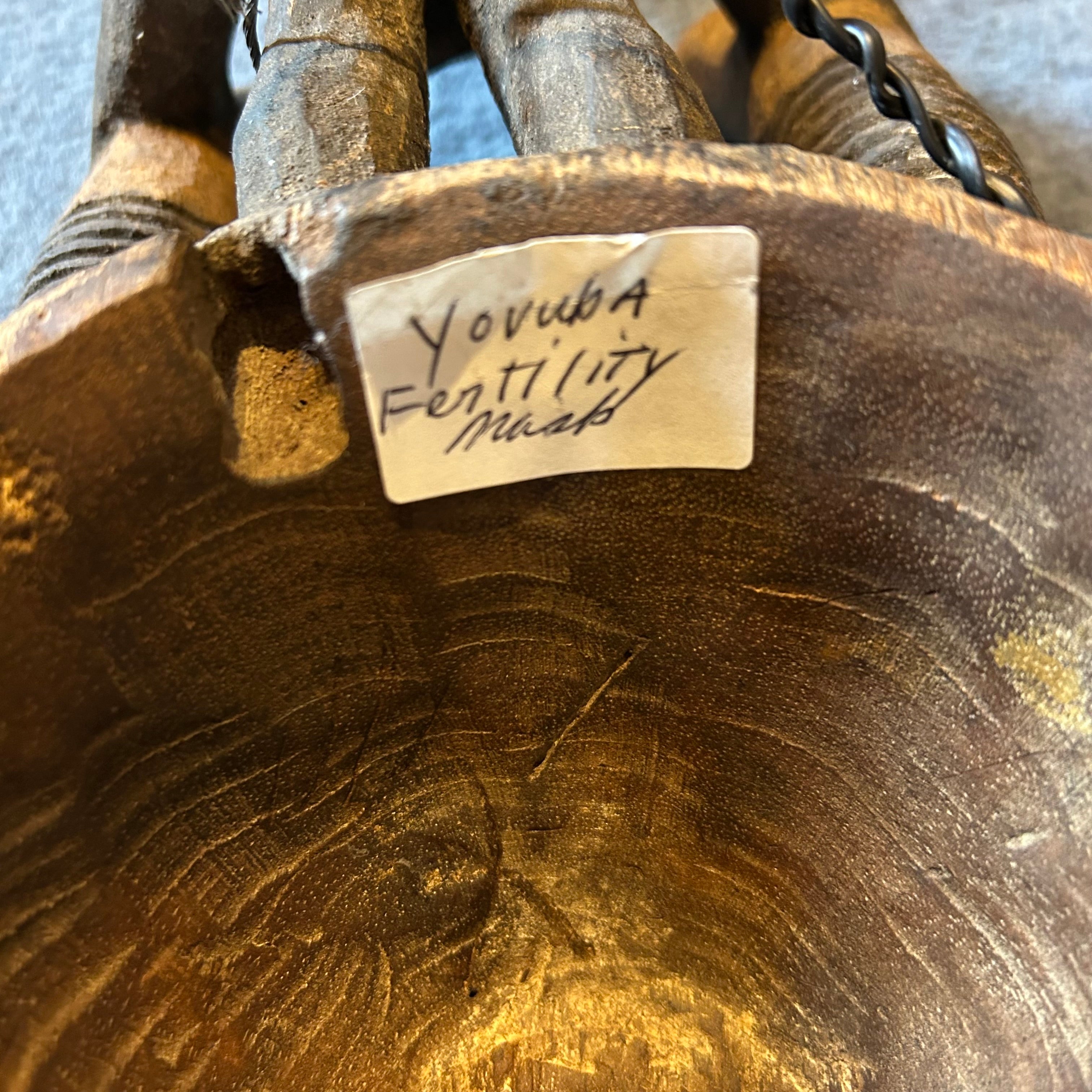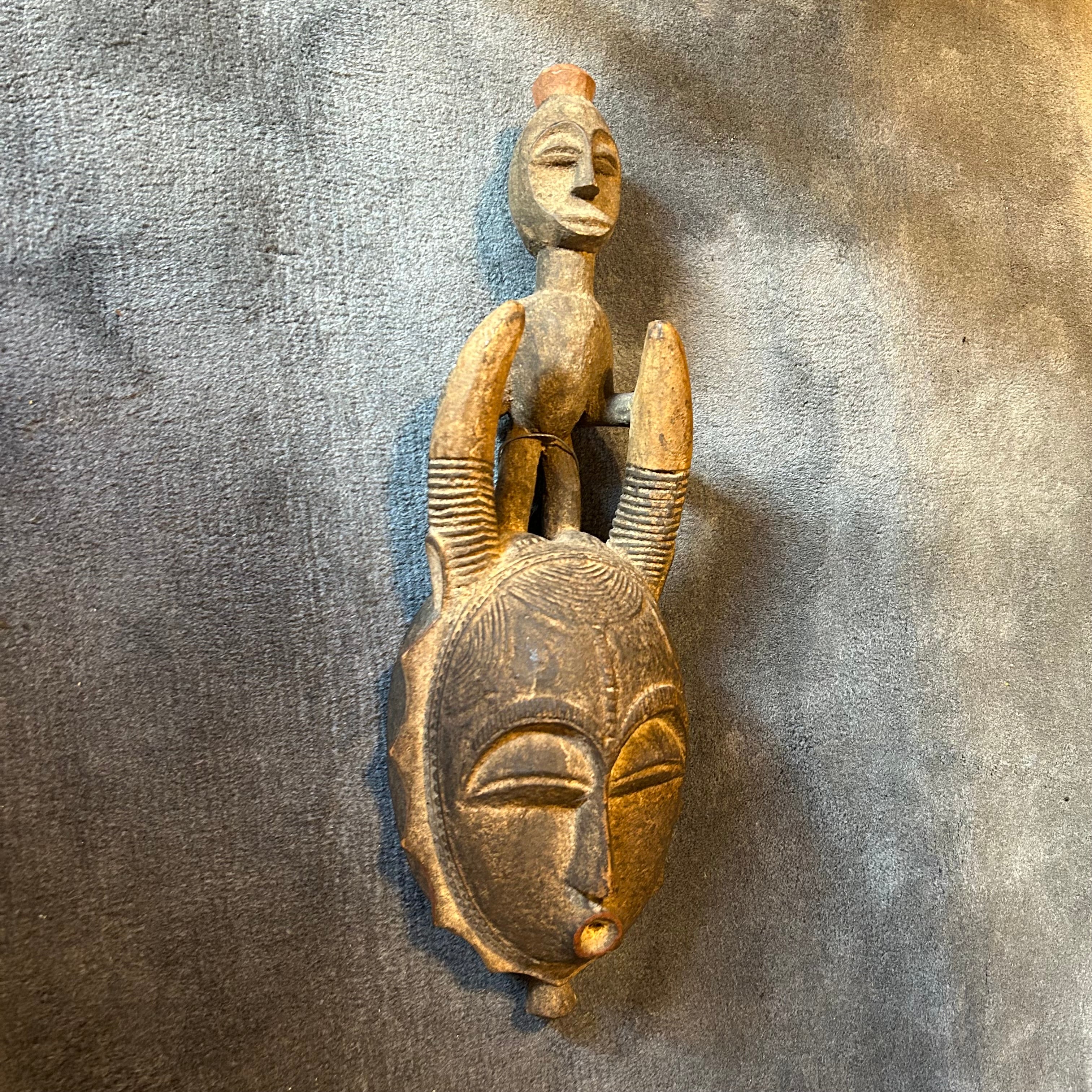 Yaruba Fertility Mask, hand carved wood with a figure standing on the top of the lower mask which as horns.